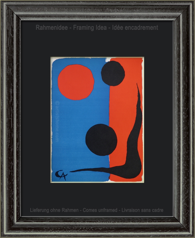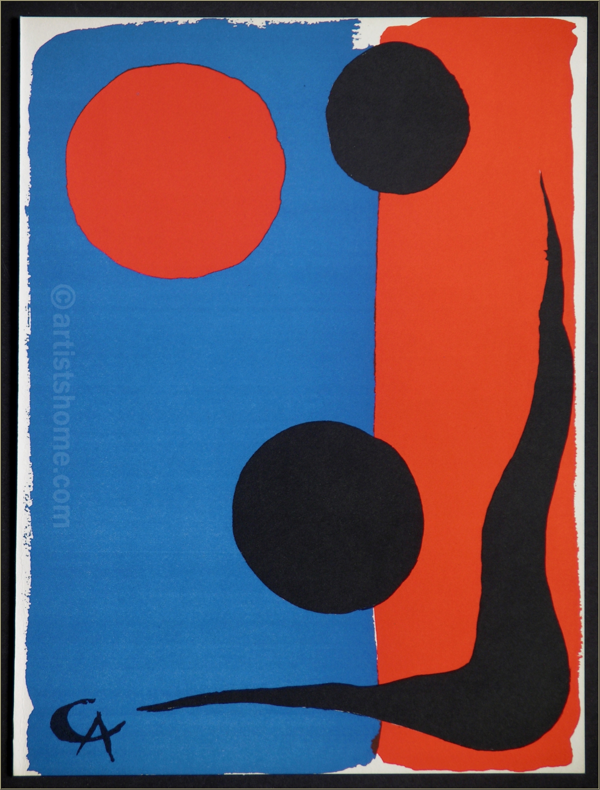 Abstrakte Arbeit mit einem roten und zwei schwarzen Kreisen auf Blau und Rot. Im Stein monogrammiert "CA". Diese Originalgrafik wurde zusammen mit Arbeiten weiterer Künstler auf Büttenpapier für den aufwändig gemachten Ausstellungskatalog "Graphik, Lithographien und illustrierte Originalbücher des Maeght-Verlags" von der Redfern-Galerie in London herausgegeben und ist heute wegen ihrer Seltenheit ein gesuchtes Sammlerstück.