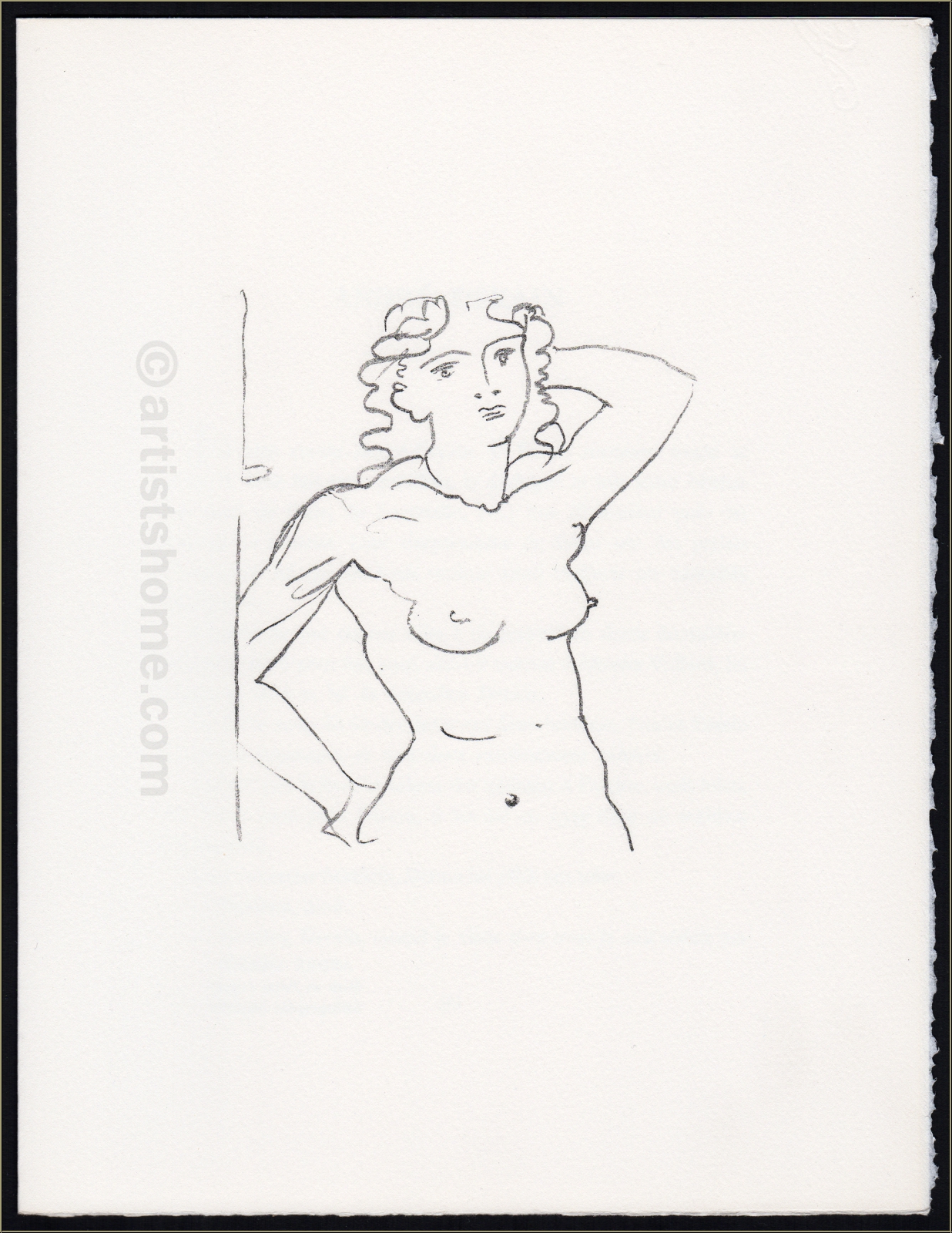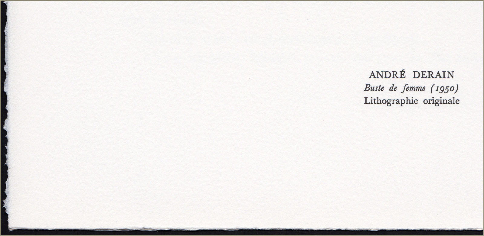 Details:"Buste de femme" 1950 / 1972 Dieser zarte und doch kraftvolle Frauenakt, den Derain bereits 1950 auf den Stein gezeichnet hatte, war der Beitrag des Künstlers zu einem aufwändig illustrierten Portfolio, mit dem der Meisterdrucker und -lithograph Fernand Mourlot seiner langjährigen Zusammenarbeit mit den ganz Großen der bildenden Kunst aus der Ecole de Paris gedachte. Einige von ihnen, darunter Braque, Matisse, Villon, Derain und Giacometti, lebten 1972 bereits nicht mehr, andere - wie Picasso - starben kurz darauf. Souvenirs et portraits d'artistes gilt deshalb als Vermächtnis des begnadeten Handwerkers und Verlegers. Der bereits 1954 verstorbene André Derain zeichnete sein "Brustbild einer Frau" vier Jahre vor seinem Tod. Die Erlaubnis zum späteren Druck als Original-Lithographien erhielt Fernand Mourlot von den im Jahr 1972 längst verstorbenen Künstlern Braque, Cocteau, Derain, Giacometti und Villon noch zu deren Lebzeiten, als er viele Jahre zuvor bereits ein "Buch der Freundschaft" plante mit dem Titel "Adieu à la rue de Chabrol", dem früheren Firmensitz des Ateliers Mourlot. Dieses Werk wurde jedoch nie realisiert, sodass diese Lithographie erst 22 Jahre nach ihrer Entstehung der Öffentlichkeit zugänglich wurde.