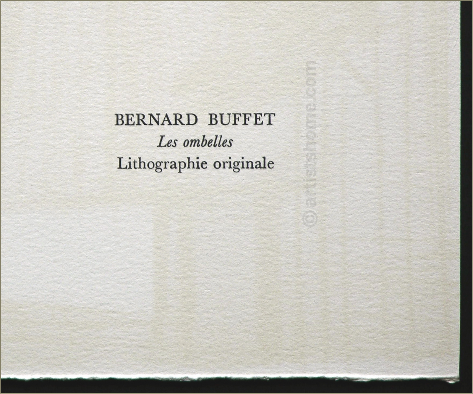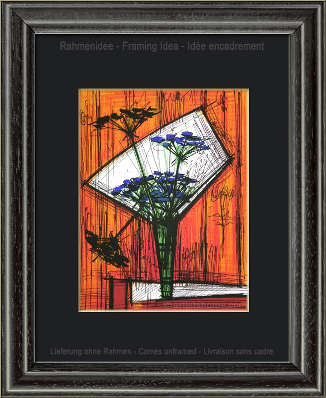 | | "Les ombelles" (Die Dolden), 1972 Prächtige Original-Farblithographie mit blauen Wiesenblumen in einer schlichten Vase vor orangefarbenem Hintergrund, gedruckt auf kräftigem Arches Bütten. Von Bernard Buffet für die Vorzugsausgabe von Fernand Mourlots Portfolio "Souvenirs et portraits d'artistes" als Steindruck gearbeitet. Dies ist KEINE später gedruckte Kaufhaus-Massenware (Kunstdruck wie z.B. Grano- oder Offset-Lithographie), sondern die Original-Lithographie für die Vorzugsausgabe von Mourlots Buch über sein Lebenswerk. ACHTUNG: aktuell werden im Netz identisch aussehende Drucke angeboten - hierbei handelt es sich um gefälschte Nachdrucke (Raubkopien). Diese Grafiken sind KEINE Original-Lithographien, auch wenn sie auf der Rückseite mit "Lithographie originale" bedruckt und für den Laien kaum zu unterscheiden sind! (s. auch letztes Foto) | Auflage: | Eines von 800 unsignierten Exemplaren für die Vorzugsausgabe | | Größe: | 32,5 x 25 cm (Blattgröße) | | Verleger: | Alain C. Mazo, Paris u. Léon Amiel, New York, 1972 | | Anmerkung: | Rückseitig typografisch bezeichnet: Bernard Buffet - Les ombelles - Lithographie originale. | Werkverzeichnis/ Referenz: | Verweis: https://mourlot.com: "Livres de Fernand Mourlot" (in französischer Sprache) Sie erhalten mit der Lieferung einen Identitätsnachweis (ohne Preisangabe, falls das Blatt verschenkt werden soll). Außerdem erhalten Sie eine Kopie der Impressumseite mit der Nummerierung aus der Originalkassette zu Ihrem Blatt. | | | Dieses Blatt wird durch unseren Geschenk-Service verpackt Kundenbewertungen Bisher wurde noch keine Bewertung abgegeben. Bewertungen können nur von Kunden geschrieben werden, die den Artikel gekauft haben und eingeloggt sind. Ihre persönlichen Daten werden automatisch anonymisiert (Beispiel: "Jens H., Deutschland").  *Gültig für Lieferungen nach Deutschland bei Zahlung per PayPal. Bei Zahlung per Banküberweisung verlängert sich die Lieferzeit um 1-3 Tage ab dem Tag, an dem Sie überwiesen haben. Lieferzeiten für andere Länder sowie Informationen zur Berechnung des Liefertermins finden Sie hier |
