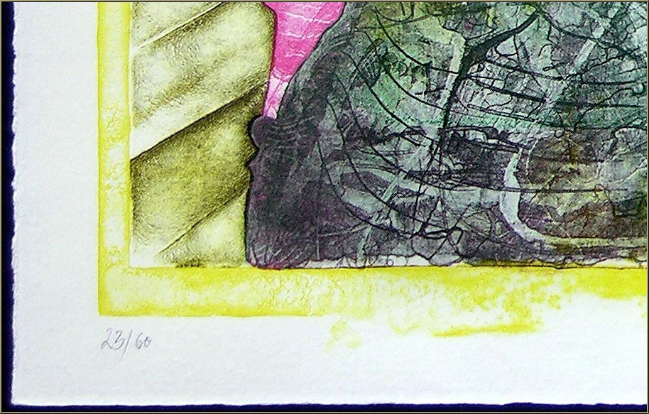 Anmerkungen: Für Bernhard Jäger hatte die Druckgrafik stets die gleiche Wichtigkeit wie seine Malerei und Zeichnungen, sie bedingten sich sogar wechselseitig in seinem künstlerischem Wachstum. Als Perfektionist und Vollbluthandwerker wiederum war nicht nur der Prozess des Lithografierens für ihn von Bedeutung, sondern auch der komplexe Druckvorgang.So gründete er schon früh (1961) zusammen mit Thomas Bayrle eine eigene Druckwerkstatt, die Gulliver-Presse, und druckte fast seine gesamte Grafik selbst.