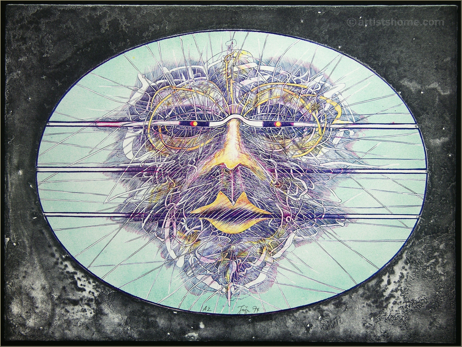 Farblithographie auf Bütten, Gesicht aus imaginären Muskel-, Nerven- und Gedankensträngen, eines der legendären "Röntgenbilder" Jägers
