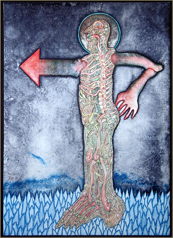 Original Farblithographie "This way" auf Bütten, handsigniert. Eines der legendären "Röntgenbilder" Jägers.