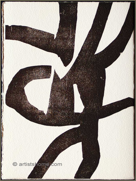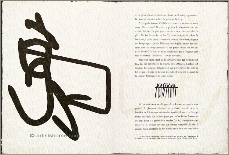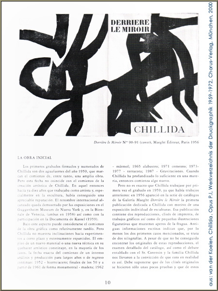 Dort heisst es unter Die frühe Arbeiten: [...] "Es ist aber nicht der Fall, dass Chillida 1959 zum allerersten Mal in der Druckgrafik gearbeitet hat, denn es gab Vorarbeiten: 1956 erschien in der Katalogreihe "Derrière le Miroir" die erste Chillida gewidmete Ausgabe, anläßlich einer Skulpturen-Einzelausstellung. Diese Ausgabe enthält 2 Klischee-Reproduktionen [Anm.: es sind 3, da van der Koelen Vorder- u. Rückseite des Originalumschlags als eine zusammengehörige Grafik bewertet, während es - zumindest in der Widergabe und auch so von Maeght beschrieben - 2 blattgroße Einzelgrafiken zu sein scheinen] von grafischen Arbeiten sowie mehrere kleine gegenständliche Illustrationen, die Schmiedewerkzeuge zeigen. Ältere schriftliche Hinweise besagen, daß es sich, zumindest bei den beiden zuerst erwähnten, um Holzschnitte handelt. [...] Andererseits erscheinen sie - abgesehen von ihrer frühen Datierung auch stilistisch - so bemerkenswert, daß sie doch hier gewürdigt werden müssen." (van der Koelen, Chillida. Opus P.I, Werkverzeichnis der Druckgraphik 1959-1972, Chorus-Verlag, München, 2000, S. 10-11, Scan s. letztes Foto).