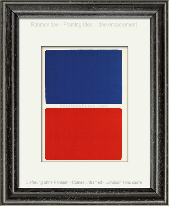 Ein blaues Rechteck oben und ein rotes darunter, beide mit "curved edges" und auf weißen Hintergrund gestellt. Dieses geometrische Abstraktion war der Beitrag Ellsworth Kellys zu einem aufwändig hergestellten Ausstellungskatalog, der zusammen mit Arbeiten weiterer bekannter Künstler unter dem Titel "Graphik, Lithographien und illustrierte Originalbücher des Maeght-Verlags" von der Redfern-Galerie in London herausgegeben wurde. Heute sind diese Originaldrucke wegen ihrer Seltenheit gesuchte Sammlerstücke.