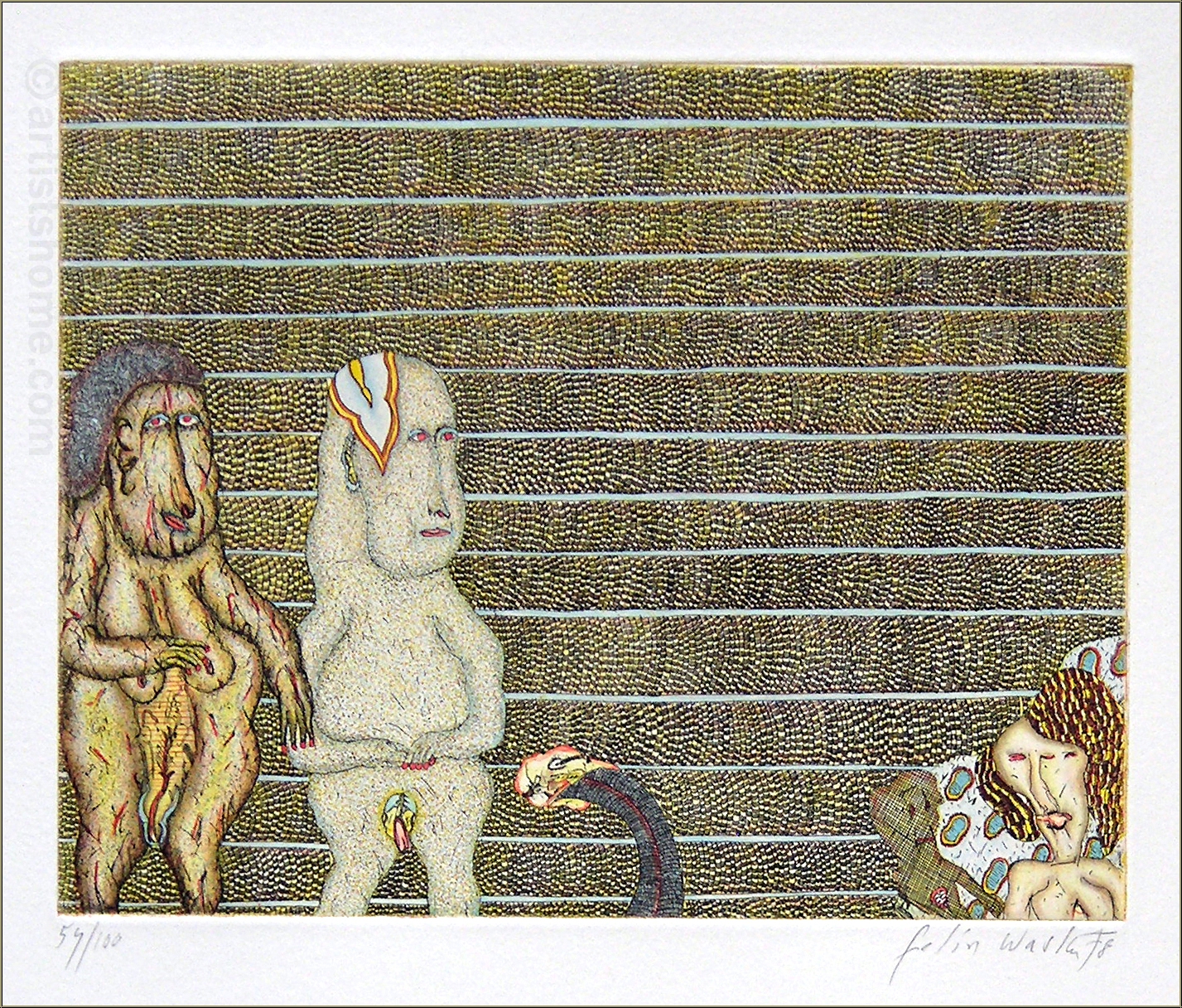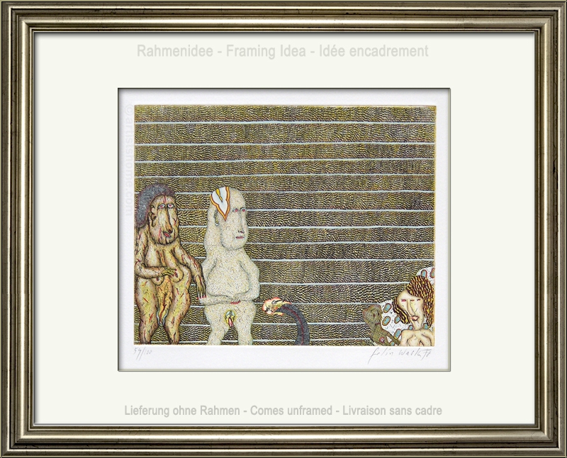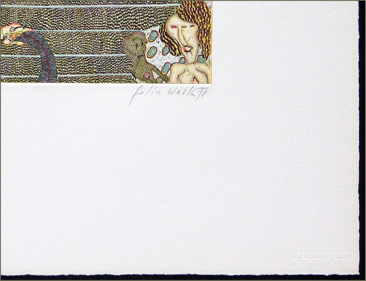 Details:"Journey to Soul" (Reise ins Innere) - 2 - Der Blick ins Nichts Gewohnt sarkastisch-humorvolle Komposition von Waske zum Thema 'Sie redet, er hört (nicht wirklich) zu' für 'Kupferne Erzählungen' von 1978. Auf kräftigem Arches Bütten, signiert, datiert und nummeriert, eines von 100 Exemplaren. Die perfekte Geschenkidee für Paare, die über sich selbst lachen können.