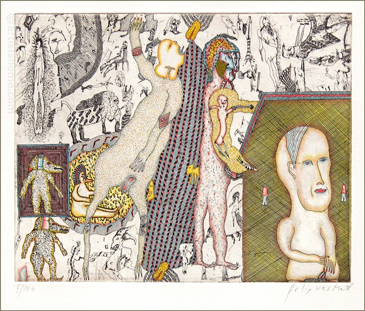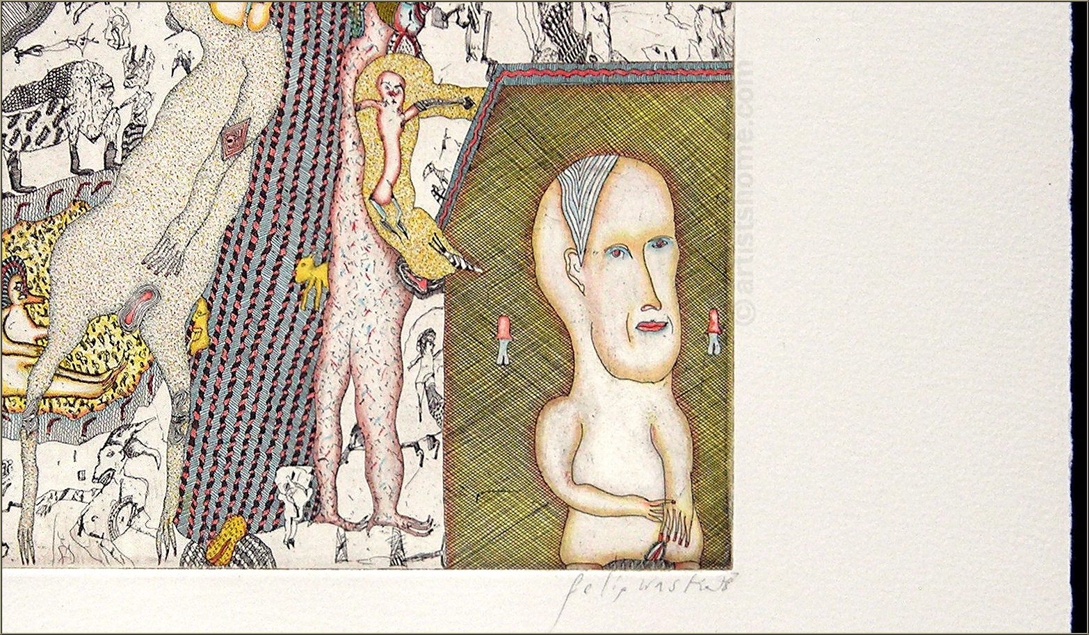 Anmerkungen: Eine von 12 Arbeiten für die Radierfolge "Kupferne Erzählungen 2", die Felix Waske zwischen 1975 und 1977 fertigte. Sie wurden auf der Handpresse abgezogen und die Radierplatten nach dem Druck gestrichen (zerstört).