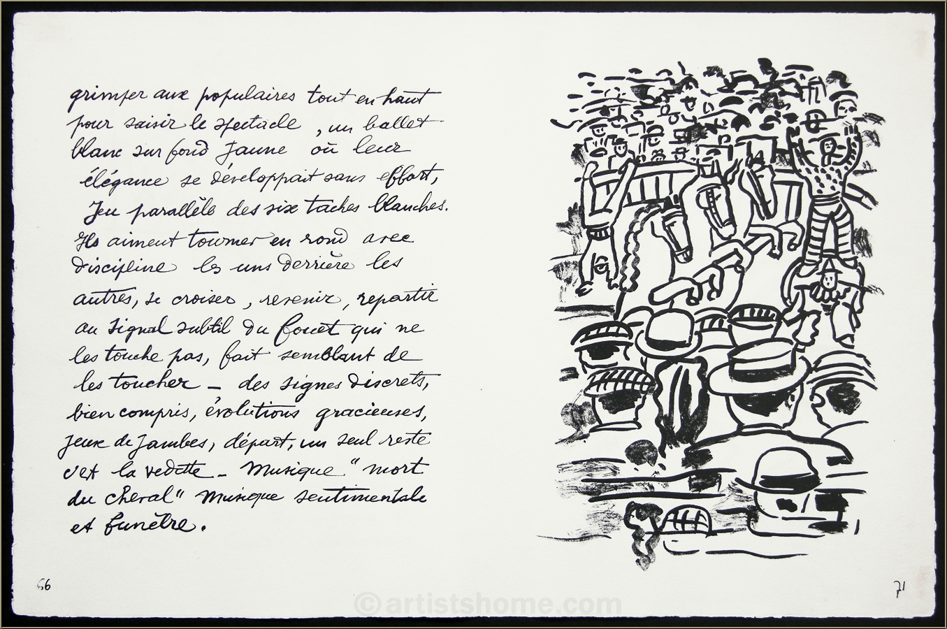 Das vorliegende Blatt ist ein unzerschnittener, doppelseitig bedruckter Probeabzug vor der Falzung für das Buch - ein Einzelstück aus unserem Bestand! Wesentliches Authentizitätsmerkmal neben den Abmessungen der Darstellung ist das Arches Wasserzeichen von 1950 im Büttenpapier. Der Bogen ist doppelseitig bedruckt mit den Buchseiten 65-66 und 71-72. Drei der vier Seiten sind als Original-Lithographien bei Saphire verzeichnet: