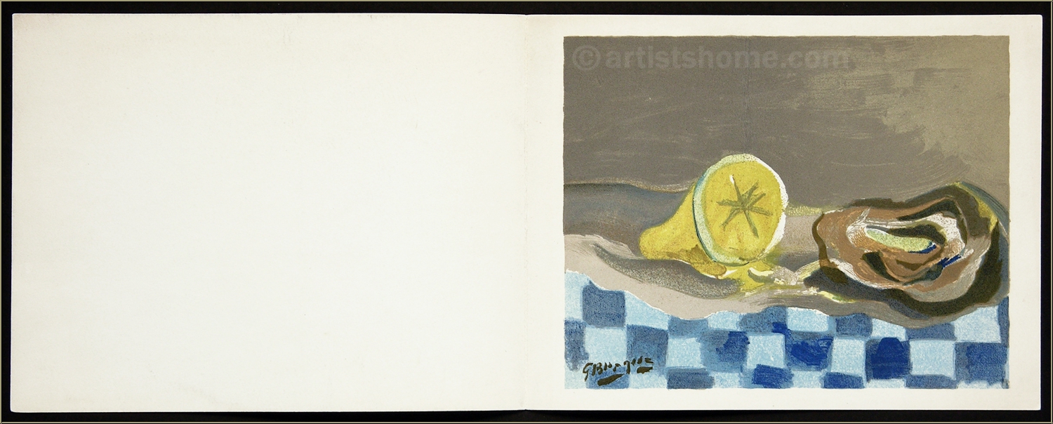 In mehreren seiner Bilder hat Georges Braque die Auster thematisiert - ob nun im Sinne von Voltaire, der ihr Schicksal als von Menschenhand verübte Barbarei beschrieb, oder nach Shakespeare ("Die Welt ist meine Auster"), sei als Interpretationsmöglichkeit dahingestellt. In dem hier vorliegenden Motiv, zusammen mit einer halben Zitrone serviert auf einer rustikalen Tischdecke, scheint sie dessen ungeachtet einzig lukullischen Genüssen zu dienen.