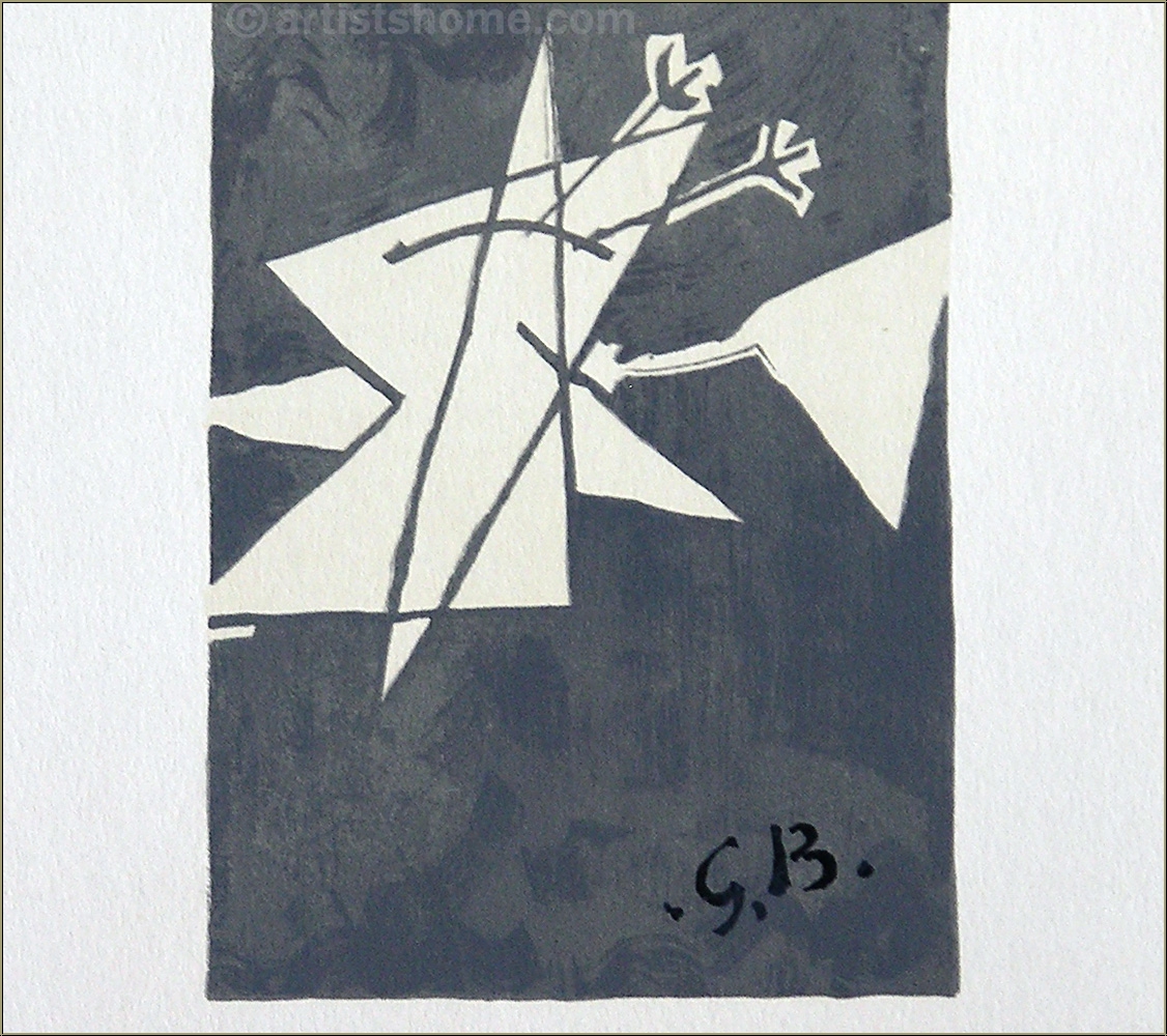 Anmerkungen: *Diese Grafik ist zwar keine Original-Lithographie von Georges Braque, sondern wurde 1959 nach einem seiner Gemälde von einem der Lithographen in der Druckerei Mourlot angefertigt, die auch sonst für Braque arbeitete (vermutlich von Henri Deschamps). Dennoch ist sie alles andere als ein Kunstdruck.