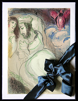 Alle Blätter bis Größe "M" (längste Seite = 39 cm, darunter fallen bspw. alle Original-Lithographien aus Marc Chagalls "Bibel" oder auch die Derriere le miroir-Ausgaben) verpacken wir verschenkfertig: das Blatt/Heft wird mittels klarsichtiger Grafikecken auf einem säurefreien Karton fixiert und in eine hochwertige, transparente Grafikhülle geschoben. Die jeweiligen Identitätsnachweise werden rückseitig eingelegt.