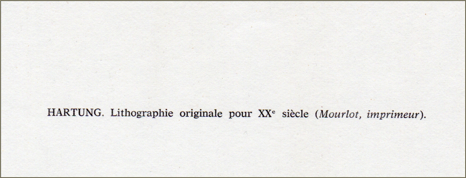 Rückseitig typografisch bedruckt: "Hartung. Lithographie originale pour XXè siècle (Mourlot, Imprimeur)."