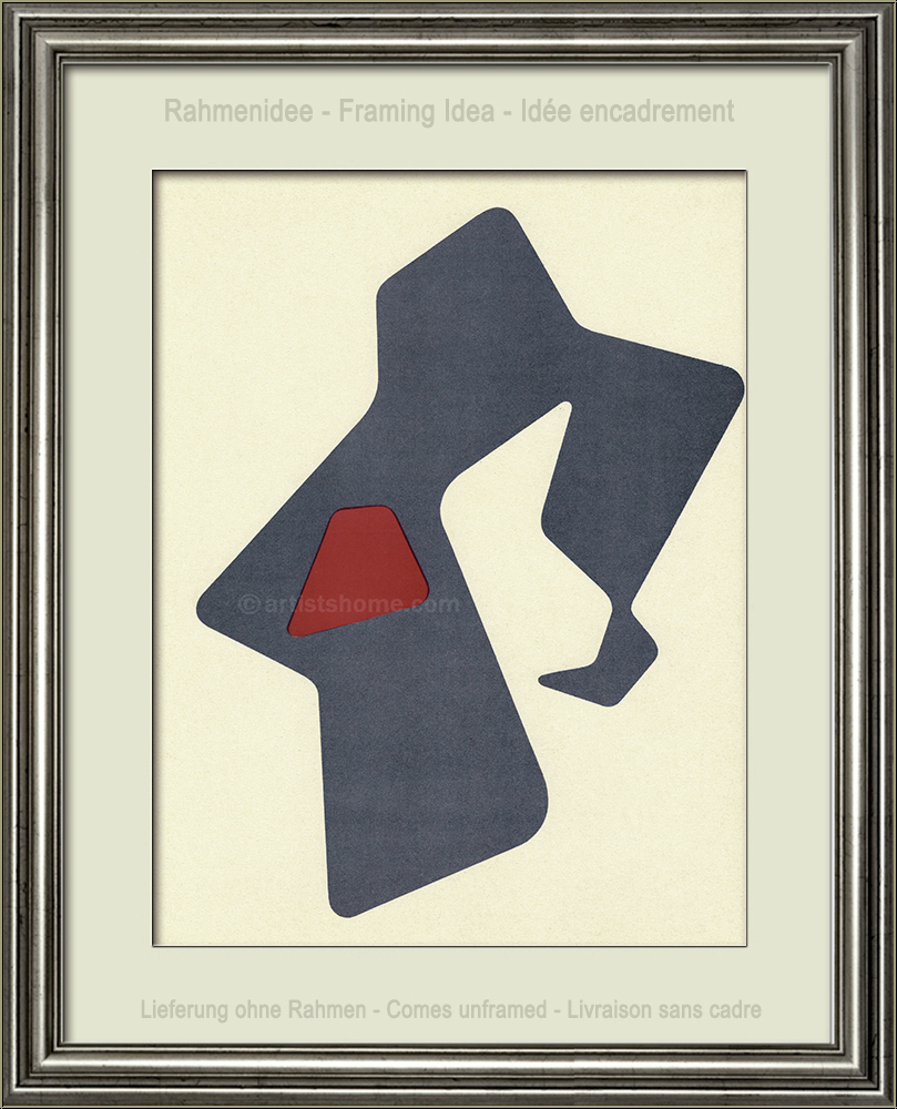 | | "Le Heaume" (Der Helm), 1951 Diese Original-Farblithographie (Werkverzeichnis Arntz Nr. 326) ist eine der ersten grafischen Arbeiten, mit denen sich Arp nach dem 2. Weltkrieg beschäftigen wollte bzw. konnte. Sie erschien schließlich in "Nouveaux destins de l'art" (Neue Schicksale der Kunst), der 1. Ausgabe des ebenfalls nach dem Krieg wieder reüssierenden französischen Kunstmagazins XXè Siècle. | Technik: | Original-Lithographie in Blaugrau und Rotbraun | | Jahr: | 1951 | | Größe: | 31,5 x 24,2 cm (Blattgröße) | | Auflage | Papier: | Eines von 1.500 unsignierten Exemplaren auf glattem, elfenfarbigem Halbkarton. Zusätzlich wurden damals 25 Exemplare für die Vorzugsausgabe abgezogen und vom Künstler signiert. | | Drucker: | Desjobert, Paris | | Verleger: | Societé Internationale d'Art. XXè Siècle, Paris | Werkverzeichnis/ Referenz: | Arntz, Wilhelm F. Hans (Jean) Arp. Das graphische Werk 1912-1966. L´oeuvre gravé - The graphic work, Gertrud Arntz-Winter, Haag 1980, Seiten 258 + 271, Nr. 326 Sie erhalten mit der Lieferung den Auszug aus diesem Verzeichnis, sowie zusätzlich unseren Identitätsnachweis (ohne Preisangabe, falls das Blatt verschenkt werden soll). | | Zustand: | Erläuterungen hierzu Sehr schönes Exemplar aus dem Archiv. In diesem Zustand außerordentlich selten! Lieferung ohne Rahmen. | Dieses Blatt wird durch unseren Geschenk-Service verpackt Kundenbewertungen Bisher wurde noch keine Bewertung abgegeben. Bewertungen können nur von Kunden geschrieben werden, die den Artikel gekauft haben und eingeloggt sind. Ihre persönlichen Daten werden automatisch anonymisiert (Beispiel: "Jens H., Deutschland").  *Gültig für Lieferungen nach Deutschland bei Zahlung per PayPal. Bei Zahlung per Banküberweisung verlängert sich die Lieferzeit um 1-3 Tage ab dem Tag, an dem Sie überwiesen haben. Lieferzeiten für andere Länder sowie Informationen zur Berechnung des Liefertermins finden Sie hier |