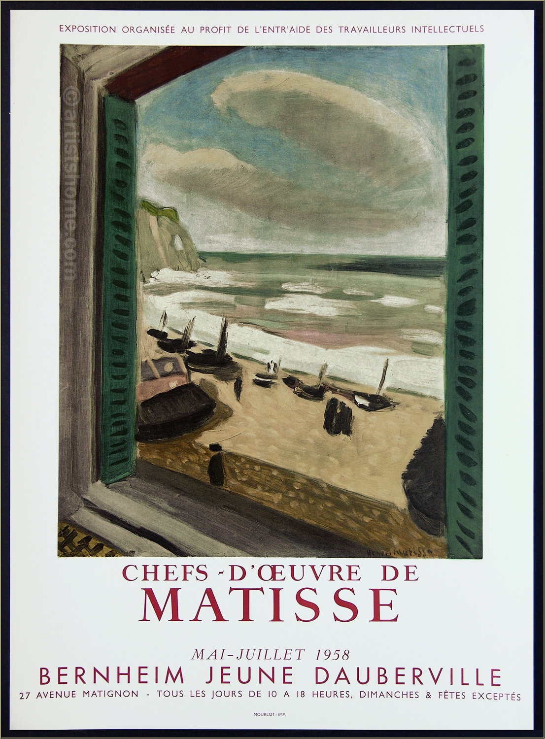 Für dieses stimmungsvolle Ausstellungsplakat lithographierte Mourlot eines der frühen Meisterwerke von Matisse, den Blick aus dem "Fenster in Etretat" (Fenètre à Etretat) auf den winterlichen Strand des Fischerdorfes in der Normandie mit seinen Steilküsten und Fischerbooten.