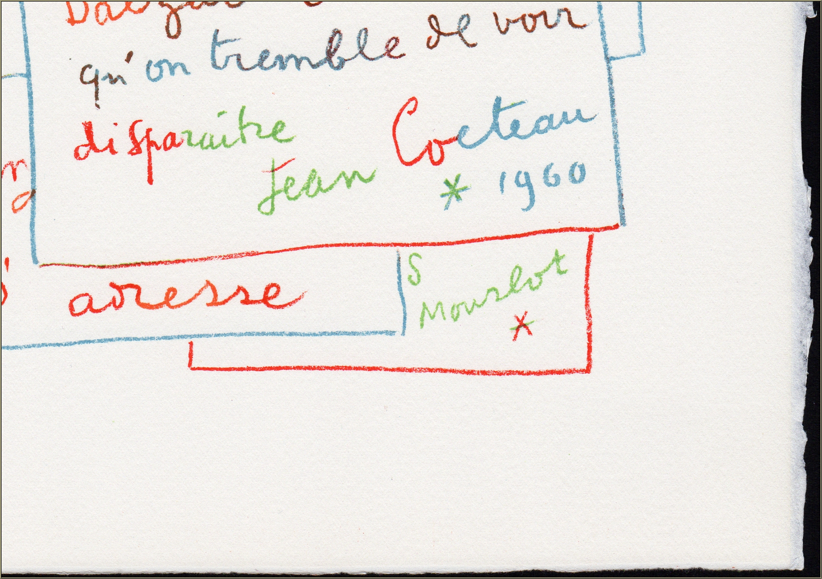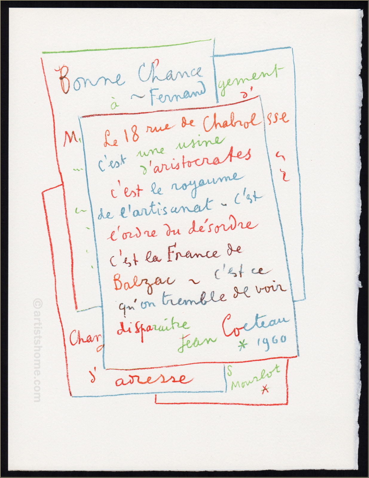 Für die hier angebotene Original-Lithograhie legte Cocteau auf einen kleinen imaginären Stapel beschriebener Blätter obenauf eine Grußnote an Fernand Mourlot. Es muss ihm zu dieser Zeit wichtig gewesen sein, seinem Freund und langjährigen handwerklichen Gefährten Glück zu wünschen, mit folgenden Worten: "Le 18 rue de chabrol c'est une usine d'aristocrates. C'est le royaume de l'artisanat - c'est l'ordre du désordre. C'est la France de Balzac - c'est ce que on tremble de voir disparaitre". Mit seinem letzten Satz, der sich fast wie ein tragischer Abschied liest, nimmt Cocteau Bezug auf den zu dieser Zeit geplanten Umzug der Druckerei von der rue de Chabrol in das 13. Arrondissement.