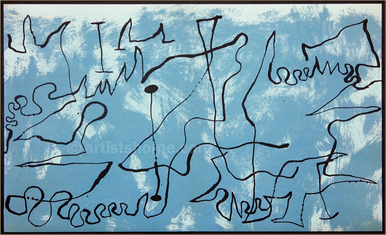 Ein Labyrinth, das sich aus Buchstaben, Ornamenten und mysteriösen Zeichen zusammenzusetzen scheint. Was genau da vor dem himmelblauen Grund unsere Aufmerksamkeit auf sich zieht, bleibt Mirós Geheimnis, denn wie so oft gab Miró auch dieser Originalgrafik keinen Titel. Abstraktionen wie diese mit symbolhaften Bildkonstruktionen sind charakteristisch für Joan Miró, sie scheinen ihm quer durch alle Lebenszyklen immer wieder ein elementares Bedürfnis gewesen zu sein. Das Blatt besticht insbesondere durch seine Ambivalenz von Ruhe durch die Blautöne und Lebhaftigkeit durch die Strichführung.