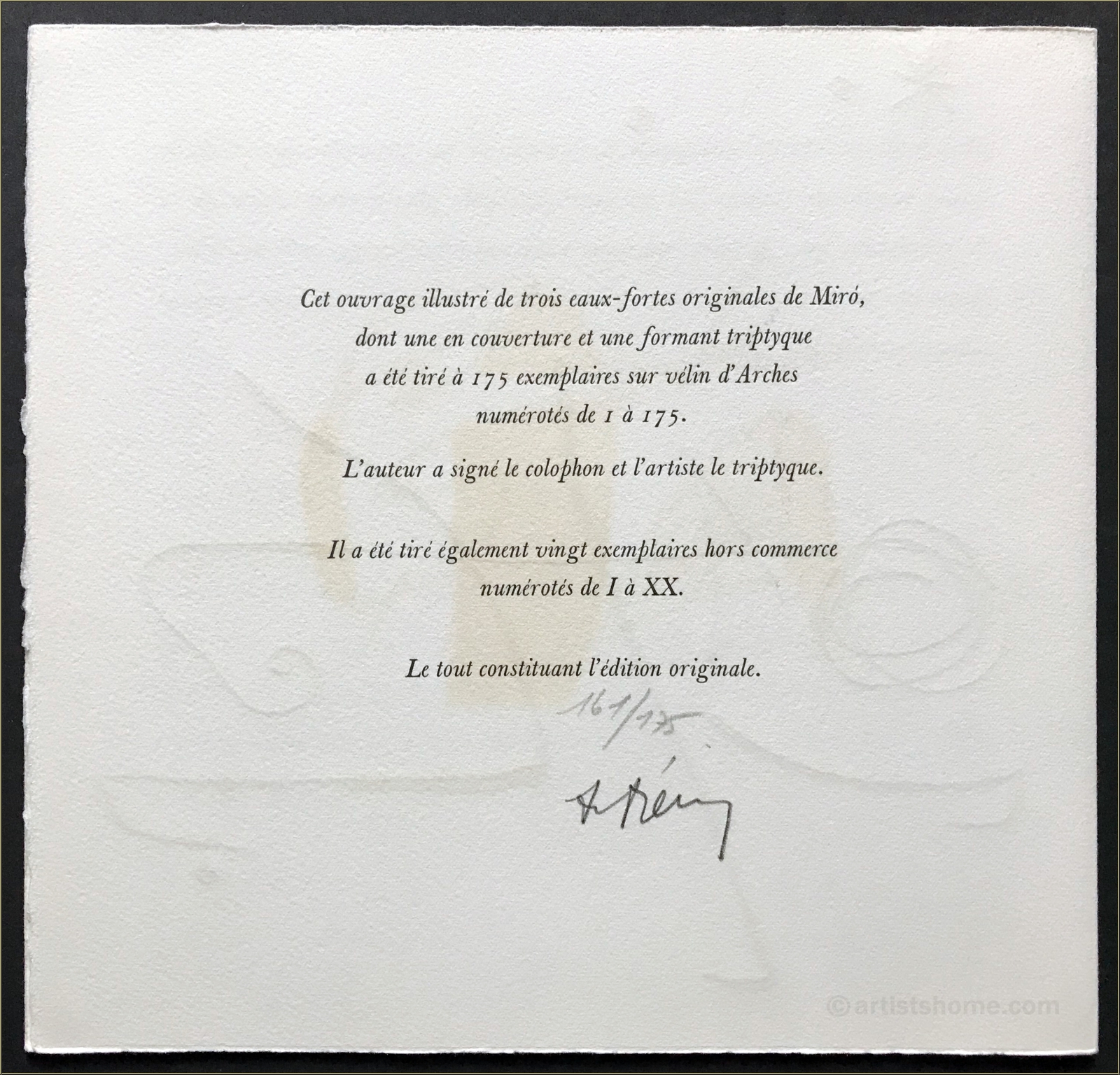 | | Seltenes, von Miró liebevoll illustriertes Künstlerbuch mit 2 Aquatinta-Radierungen Art.-Nr.: MIR-78-05 Lieferzeit: Preis: 795,00 € Vorkassepreis: 755,25 € (inkl. MwSt., differenzbesteuert gem. §25a UStG, kein Ausweis der MwSt.) Fair, sicher und bequem einkaufen: Für mehr Details bitte klicken  Lieferzusage - alle angebotenen Artikel sind sofort lieferbar!  5% Skonto bei Vorkasse-Zahlung per Banküberweisung  Wir verkaufen Originalgrafik, und keine später hergestellten Kunstdrucke |