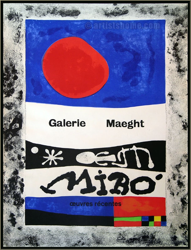 Original-Lithographie von Joan Miró für seine Ausstellung bei der Galerie Maeght in Paris, gedruckt bei Mourlot. Dies ist das sechste originalgrafische Künstlerplakat, das Miro in den Jahren von 1919 bis 1953 für eine seiner Ausstellungen gestaltet hat. Es wurde damals nur in sehr kleiner Auflage gedruckt und ist heute außerordentlich selten. Die häufig zu findenden verkleinerten Drucke sind entnommene Seiten (Reproduktionen des Originalplakates) aus einem Buch über Mourlots Posters.