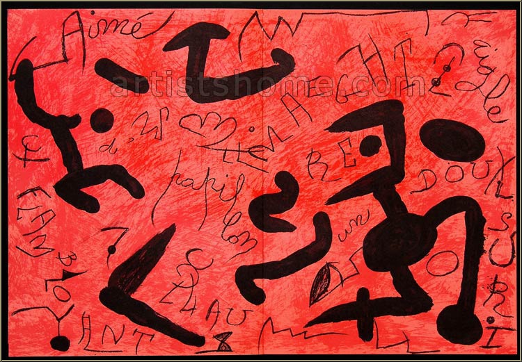 Geheimnisvolle schwarze Zeichen und Symbole auf rotem Hintergrund - große Original-Farblithographie von Joan Miro aus dem obigen Portfolio, das 1982 anläßlich des Todes des bekannten französischen Verlegerpaares Maeght (1981 starb Aimé Maeght, 4 Jahre nach seiner Frau) von 24 "seiner" Künstler mit Originalgrafik ausgestattet wurde.