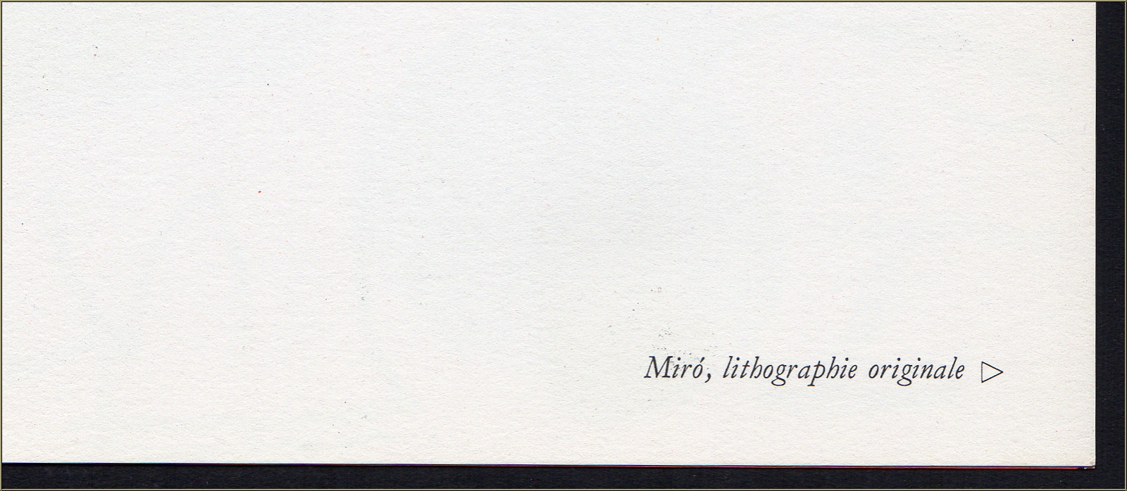 Rückseitig typographisch bedruckt (u.a. mit "Miró, lithographie originale") und mit dem typischen Mittelfalz sowie Fadenheftungslöchlein, wie erschienen.