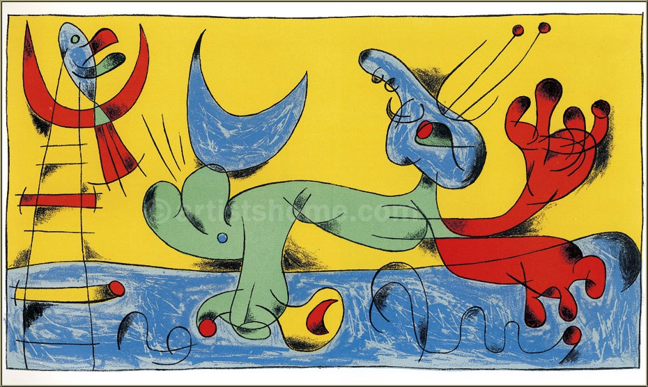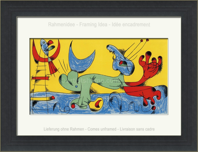 Details:Komposition (Spielender Hund) Eine Leiter, die zum Mond führt, der von einem Vogelfisch bewohnt wird und in einem gelben Universum schwebt. Noch ein auf dem Rücken liegender Mond, der sich im Schwanz des jonglierenden Hundes verfangen hat. Das alles spielt sich ab auf einer blauen Erde, die sich am rechten Bildrand am Spiel des Tiers zu beteiligen scheint. Typisch für Miró, dieser Lithographie keinen Namen gegeben zu haben und es der Fantasie des Betrachters zu überlassen, wie er das, was er zu erkennen vermag, für sich interpretiert. Menschen brauchen jedoch einen Bildtitel, um sich dazu verständigen zu können, und so hat sich für diese Grafik die Bezeichnung "Spielender Hund" eingebürgert.