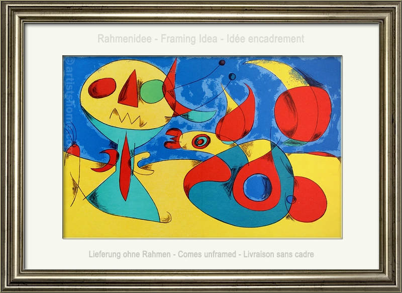 | | "Zephirvogel" (Oiseau Zéphyr), 1956 Frühe, große Original-Farblithographie mit kubistischen Elementen - Wesen aus einer anderen Welt, die irgendwo im Universum beheimatet zu sein scheinen. Dies ist KEINE später gedruckte Massenware (Kunstdruck wie z.B. Grano- oder Foto-Lithographie), sondern die Original-Lithographie von Joan Miró aus dem Jahr 1956. | Auflage / Papier | Hier eines von ca. 2.500 unsignierten Exemplaren auf glattem Velin. Zusätzlich wurden damals 100 Exemplare auf Arches Bütten gedruckt und vom Künstler signiert und nummeriert. | | Größe: | 38 x 56 cm (Blatt) - 35 x 53 cm (Darstellung) | | Verleger: | Maeght Éditeur, Paris | | Anmerkung: | Rückseitig typografisch bedruckt, wie 1956 in "Terres de grand feu" erschienen. | | Besonderheit: | Mit fachgerecht geglättetem Mittelfalz (s. unter "Zustand"), ideal zum Einrahmen. | Werkverzeichnis/ Referenz: | Mourlot, F., Joan Miró. Der Lithograph Bd. II, Maeght, Paris, 1975, Weber, Genf, S. 78, Nr. 159, mit Abb. Sie erhalten mit der Lieferung den Auszug aus diesem Verzeichnis, sowie zusätzlich zur Rechnung einen Identitätsnachweis (ohne Preisangabe), falls das Blatt verschenkt werden soll. | | Zustand: | Erläuterungen hierzu Sehr schönes Exemplar aus dem Archiv. In diesem Zustand selten! Lieferung ungerahmt. | | | Diese seltene Originalgrafik wurde von unserem Restaurator auf kalandertes Leinen aufgezogen, um das wertvolle Blatt zu stabilisieren und den obligatorischen Mittelfalz zu glätten - er ist nun nahezu unsichtbar, sodass die Grafik wunderbar gerahmt werden kann. Mehr über die konservatorische Erhaltung alter Grafiken und Plakate | | | Kundenbewertungen Bisher wurde noch keine Bewertung abgegeben. Bewertungen können nur von Kunden geschrieben werden, die den Artikel gekauft haben und eingeloggt sind. Ihre persönlichen Daten werden automatisch anonymisiert (Beispiel: "Jens H., Deutschland").  *Gültig für Lieferungen nach Deutschland bei Zahlung per PayPal. Bei Zahlung per Banküberweisung verlängert sich die Lieferzeit um 1-3 Tage ab dem Tag, an dem Sie überwiesen haben. Lieferzeiten für andere Länder sowie Informationen zur Berechnung des Liefertermins finden Sie hier |