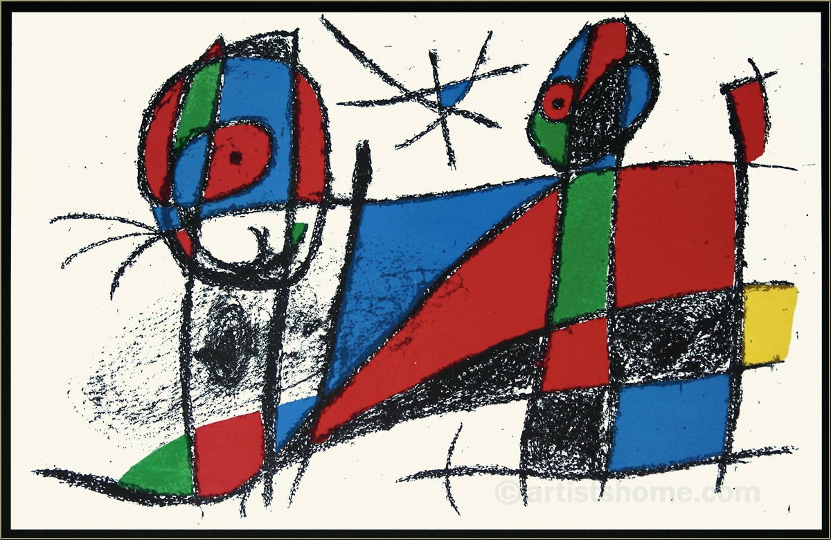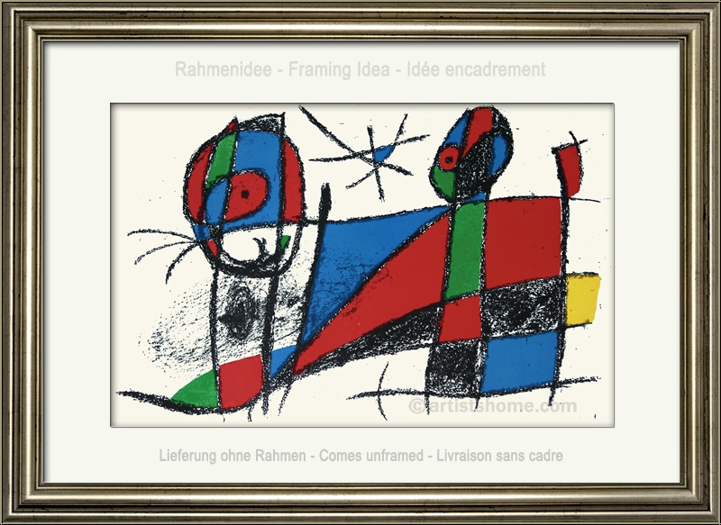 Details:»Originallithographie VI« - Motiv: Katze Katzenfreunden ist dieser Anblick bestens vertraut: es wird sich nochmal genüsslich und ausführlich geräkelt, bevor man auf Wanderschaft geht Auch die Schnurrhaare sprechen dafür, dass wir es hier eher mit einer Katze à la Miró zu tun haben, und nicht etwa mit einer liegenden Sphinx. Wobei in den Bildwelten des katalanischen Künstlers die Grenze zwischen realen Gestalten und imaginären Fabelwesen ohnehin nicht existierte, sondern jede Form und alle Farbe zu einem meist freundlich-heiteren Gesamtszenario verschmolz. Diese Grafik braucht keinen Titel, er findet sich in uns selbst, wenn wir Mirós Bildsprache offen gegenüber treten.