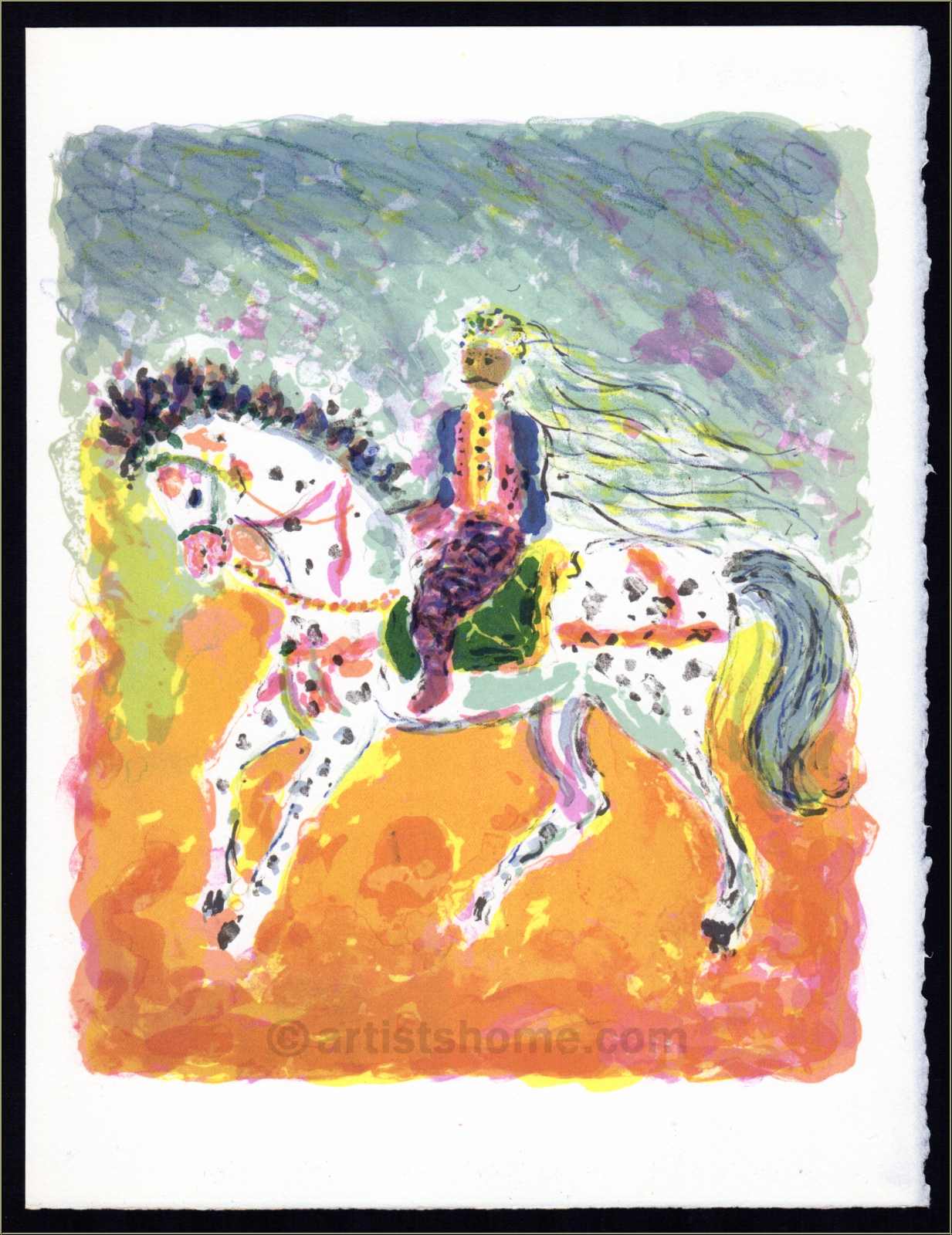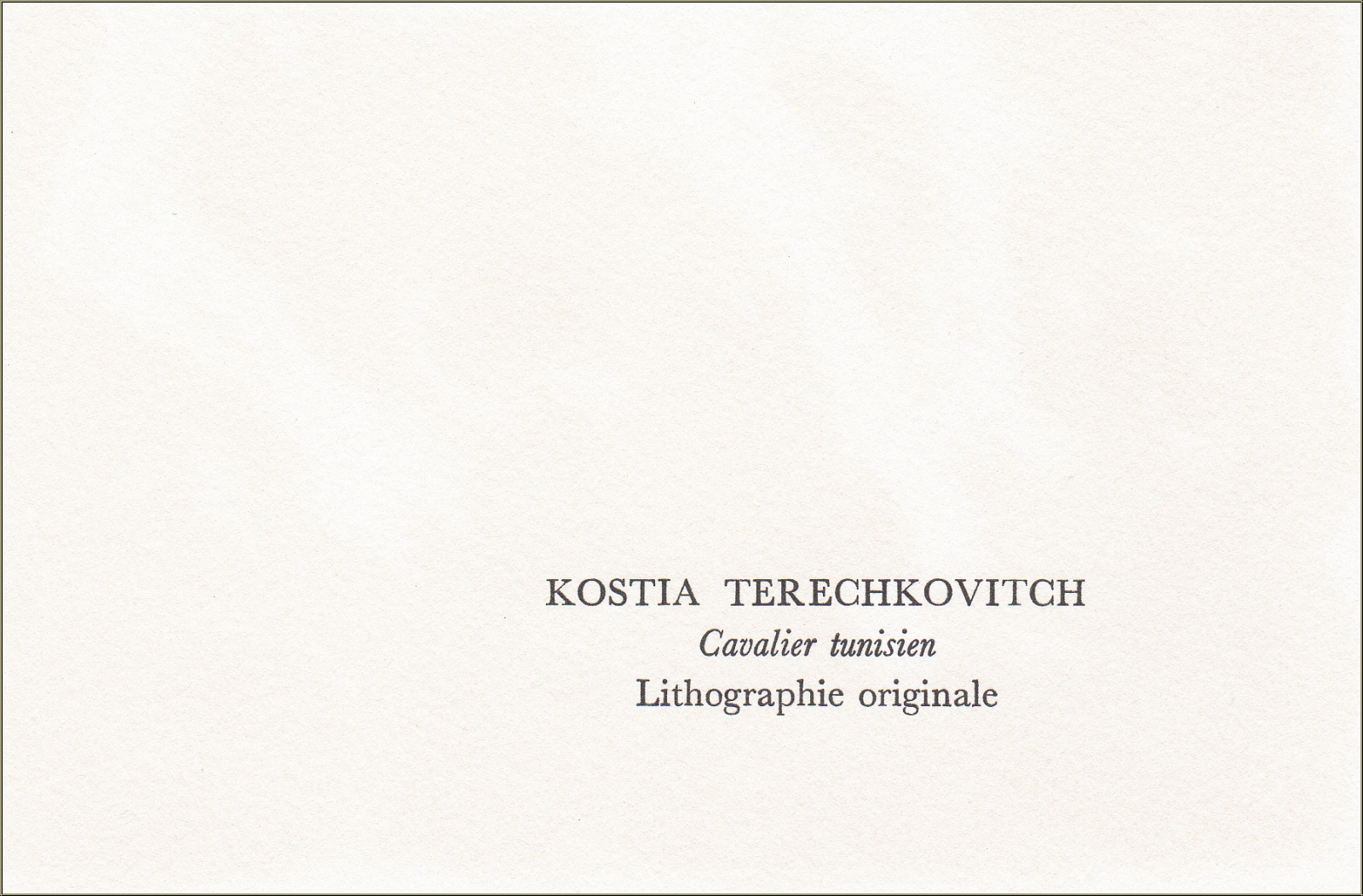 | | "Cavalier tunisien" (1972) Dieser festlich geschmückte tunesische Reiter auf seinem stolzen Pferd (augenscheinlich ein Araber) war der Beitrag des Künstlers zu einem Portfolio mit wertvollen Originalgrafiken, mit dem der Meisterdrucker und -lithograph Fernand Mourlot seiner langjährigen Zusammenarbeit mit den ganz Großen der bildenden Kunst aus der Ecole de Paris gedachte. Einige von ihnen, darunter Braque, Matisse, Villon und Giacometti, lebten 1972 bereits nicht mehr, andere - wie Picasso - starben kurz darauf. "Souvenirs et portraits d'artistes" gilt deshalb als Vermächtnis des begnadeten Handwerkers und Verlegers. Dies ist KEINE später gedruckte Massenware (Kunstdruck wie z.B. Grano- oder Offset-Lithographie), sondern die Original-Lithographie aus der Vorzugsausgabe von Mourlots Buch über sein Lebenswerk. | Auflage: | Eines von 800 unsignierten Exemplaren der Vorzugsausgabe auf Arches | | Größe: | 32,5 x 25 cm (Blattgröße) | | Verleger: | Alain C. Mazo, Paris u. Léon Amiel, New York, 1972 | | Anmerkung: | Rücks. typografisch bezeichnet: "Kostia Terechkovitch - Cavalier tunisien - Lithographie originale" | Werkverzeichnis/ Referenz: | Verweis: https://mourlot.com: "Livres de Fernand Mourlot" (in französischer Sprache) | | | Dieses Blatt wird durch unseren Geschenk-Service verpackt Kundenbewertungen Bisher wurde noch keine Bewertung abgegeben. Bewertungen können nur von Kunden geschrieben werden, die den Artikel gekauft haben und eingeloggt sind. Ihre persönlichen Daten werden automatisch anonymisiert (Beispiel: "Jens H., Deutschland").  *Gültig für Lieferungen nach Deutschland bei Zahlung per PayPal. Bei Zahlung per Banküberweisung verlängert sich die Lieferzeit um 1-3 Tage ab dem Tag, an dem Sie überwiesen haben. Lieferzeiten für andere Länder sowie Informationen zur Berechnung des Liefertermins finden Sie hier |