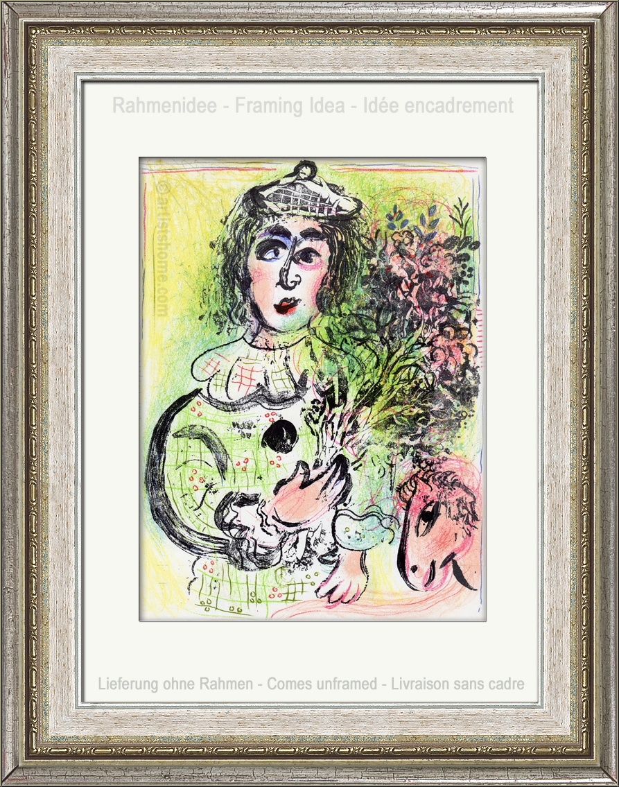 | | "Blumengeschmückter Clown" (Mourlot 399) Schon die verwendeten Pastelltöne Maigrün, Sonnengelb und Zartrosa machen deutlich - hier geht es um die schönste Herzensangelegenheit, die Liebe. Ein etwas verklärt und gleichzeitig schüchtern dreinblickender Clown drückt einen riesigen Blumenstrauß an sein Herz und scheint von Chagalls Lieblingstier, dem Eselchen, angeschubst zu werden... "Na los, trau dich endlich!". | Technik: | Original-Farblithographie (Steindruck) "Le Clown fleuri" Hinweis: Dies ist KEIN späterer Kunstdruck, sondern die Original-Lithographie, wie sie exakt so auch im Werkkatalog verzeichnet ist! | | Jahr: | 1963 | | Auflage/Papier: | Hier ein Exemplar aus der unsignierten Originalauflage auf kräftigem Vélin. Zusätzlich wurden damals 150 Exemplare auf Arches Bütten mit breitem Rand abgezogen und vom Künstler signiert u. nummeriert. | | signiert: | unsigniert, wie erschienen | | Verleger: | Éditions André Sauret, Monte-Carlo, 1963 | | Anmerkung: | Für die maßgeblichen Bände über sein lithographisches Gesamtwerk schuf Marc Chagall zwischen 1960 und 1974 insgesamt 28 blattgroße Original-Lithographien, die in späteren Jahren als Kunstdrucke auf Büttenpapier reproduziert wurden und heute oft mit den Originalen verwechselt werden. | Werkverzeichnis/ Referenz: | Mourlot, Fernand. Chagall Lithograph [III] 1962-1968, André Sauret, Monte Carlo, 1969, Nr. 399 Sie erhalten mit der Lieferung den vollständigen Auszug aus dem o.g. Werkverzeichnis zu Ihrem Blatt sowie zusätzlich einen Identitätsnachweis (ohne Preisangabe, falls das Blatt verschenkt werden soll). | | | Kundenbewertungen Bisher wurde noch keine Bewertung abgegeben. Bewertungen können nur von Kunden geschrieben werden, die den Artikel gekauft haben und eingeloggt sind. Ihre persönlichen Daten werden automatisch anonymisiert (Beispiel: "Jens H., Deutschland").  *Gültig für Lieferungen nach Deutschland bei Zahlung per PayPal. Bei Zahlung per Banküberweisung verlängert sich die Lieferzeit um 1-3 Tage ab dem Tag, an dem Sie überwiesen haben. Lieferzeiten für andere Länder sowie Informationen zur Berechnung des Liefertermins finden Sie hier |