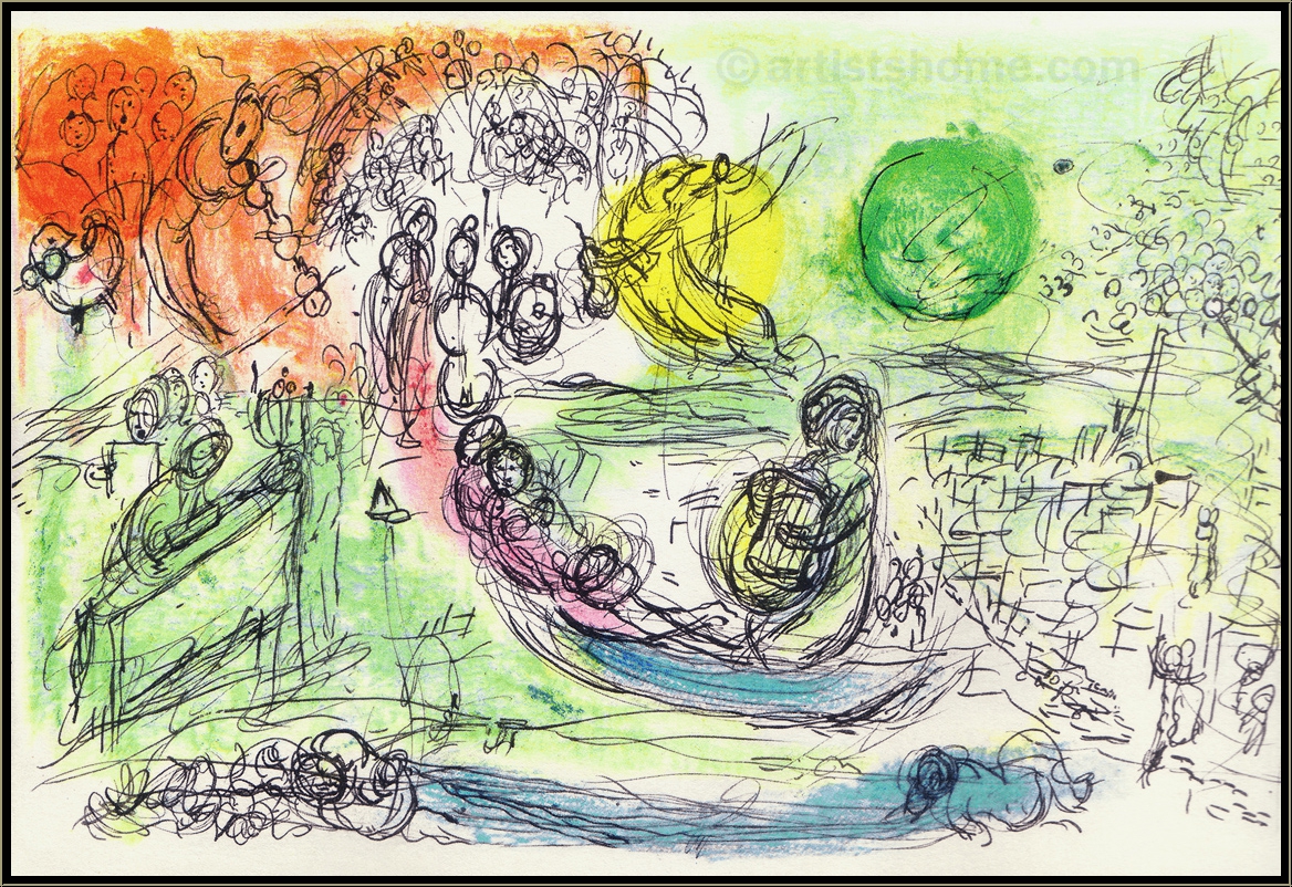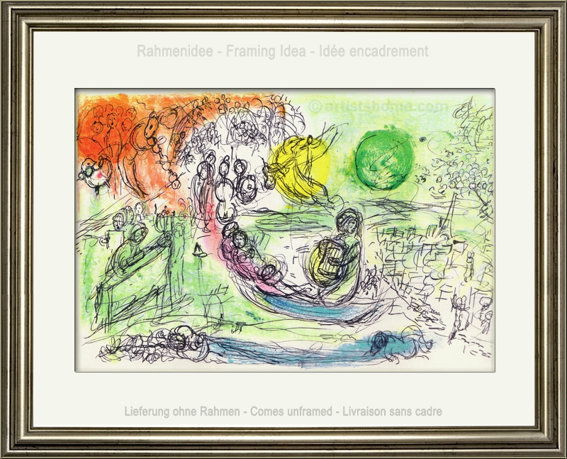 Mit dem Thema Musik beschäftigte sich Chagall zeit seines Lebens in vielen seiner Bilder. Dass er in späteren Jahren das berühmte Deckengemälde für die berühmte Opéra Garnier in Paris anfertigte, zeigt seine Verbundenheit mit den darstellenden Künsten. In dieser filigran gezeichneten und mit zarten Pastelltönen hinterlegten Farblithographie von 1957 gibt es unzählige Details zu entdecken: Menschen, die im Chor singen oder ihre Instrumente spielen, flankiert von "Chagallschem Getier", sowie andächtig lauschende Zuschauer. All das findet im Pariser Opernhaus statt, wie der skizzierte Eiffelturm unschwer erkennen lässt.