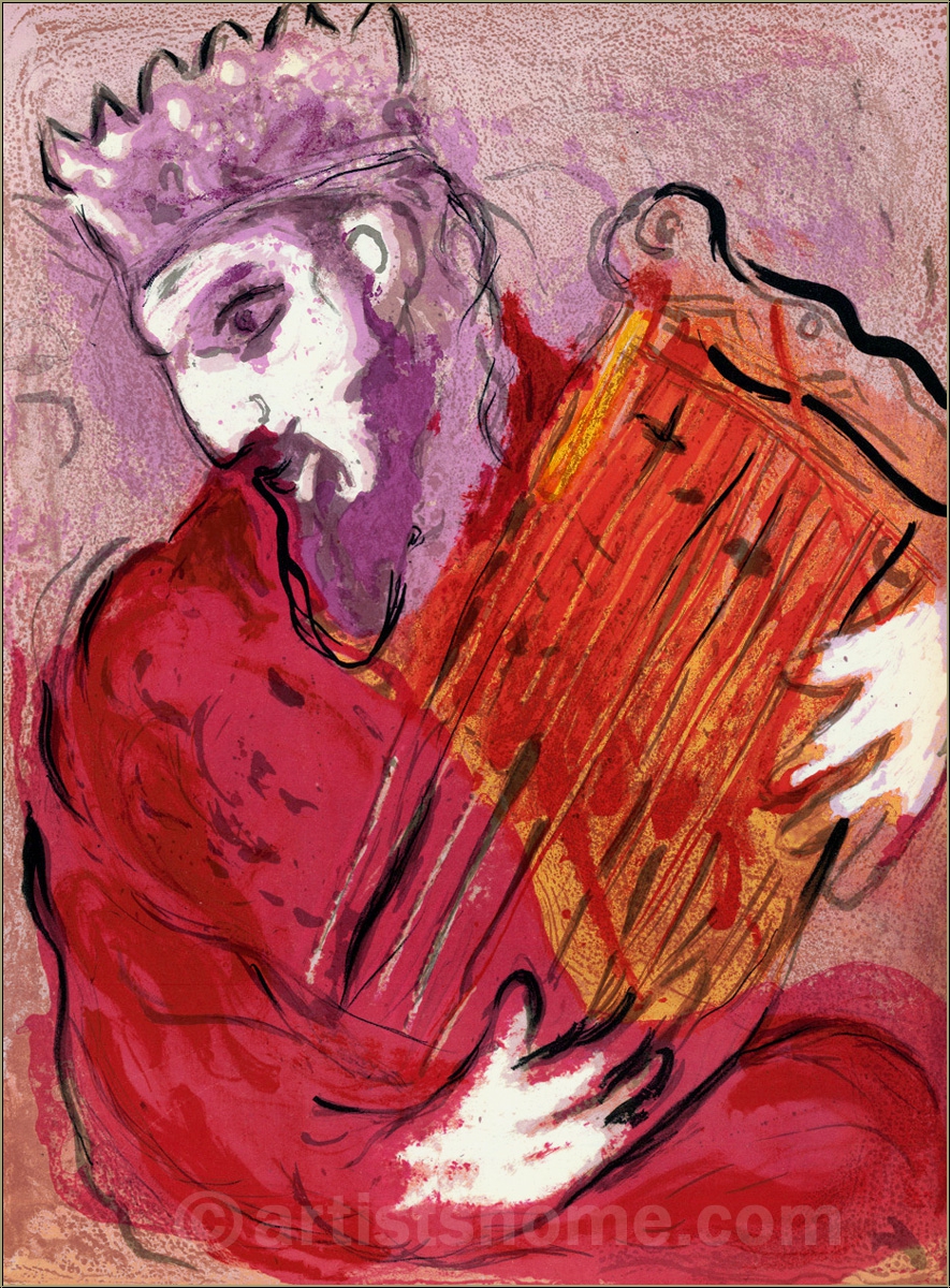 Chagall hat David in diesem Werk mit seiner Harfe dargestellt, die er meisterhaft spielte. Behutsam hält er sie in den Armen, sein Blick ist nachdenklich, gedankenverloren, in sich versunken. Das Gesicht leuchtet weiß - Zeichen für die Erleuchtung, die ihm von Gott zuteil wurde? Die gleiche weiße Farbe findet sich in seinen Händen wieder, vielleicht weil er das, was er mit Herz und Verstand erkannt hatte, auch ausführte. Der violette Hintergrund versinnbildet die Gegenwart Gottes, den eigentlichen König und Herrn über Israel.