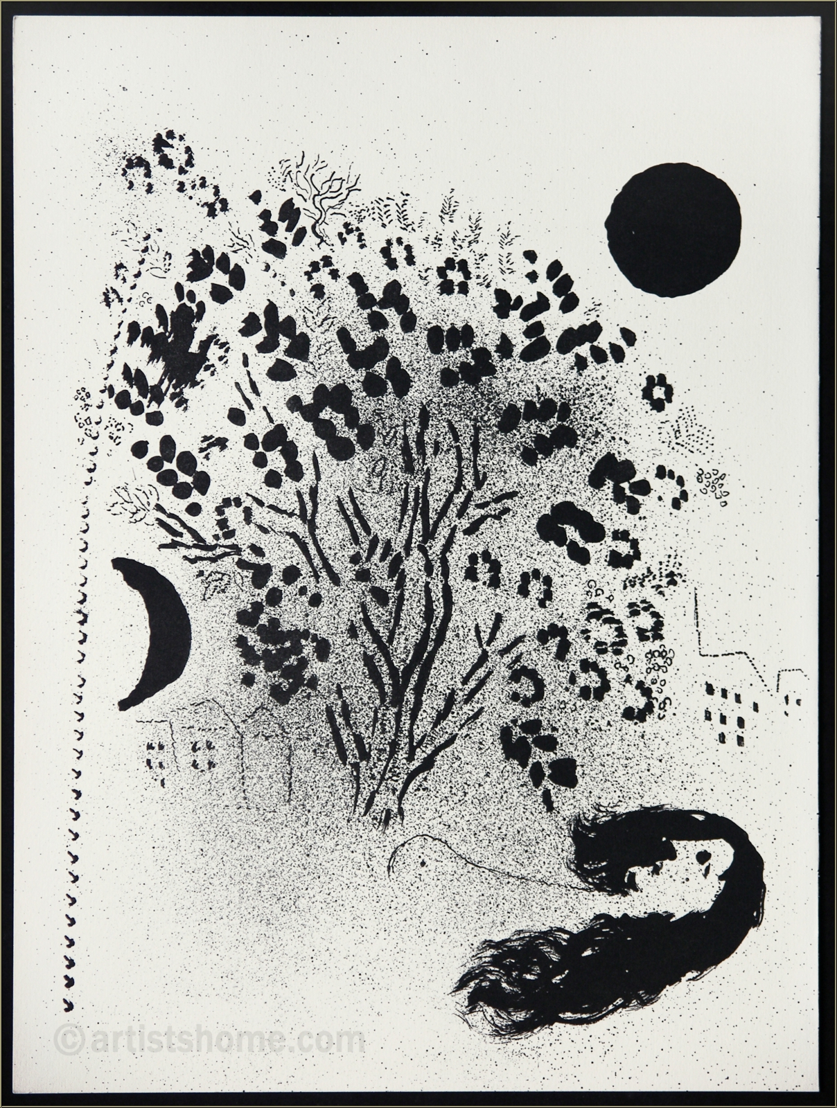 Marc Chagall: Der Abend - Le Soir, 1952, Lithographie, blühender Baum, liegende Frau, schwarze Sonne, Mond