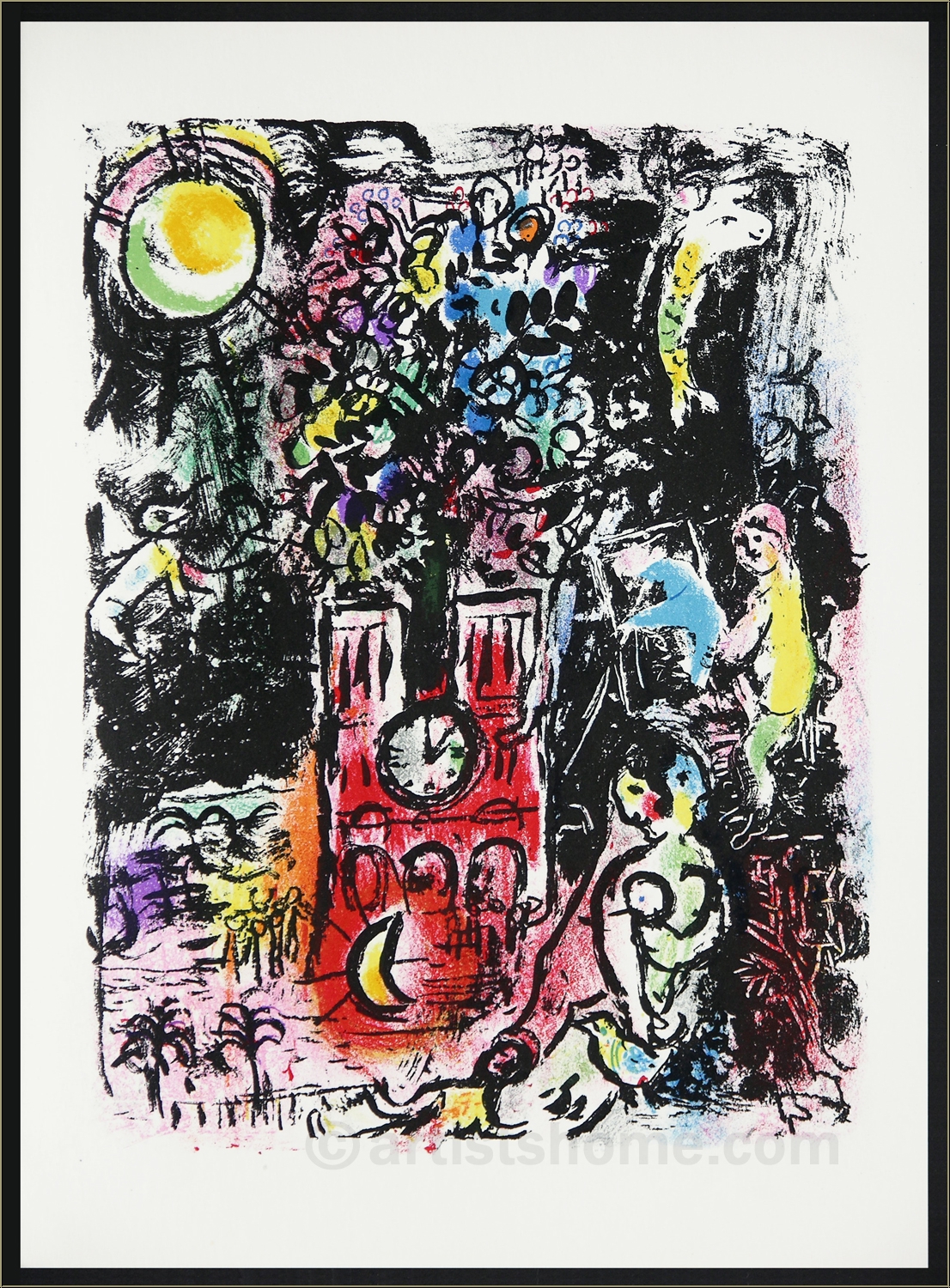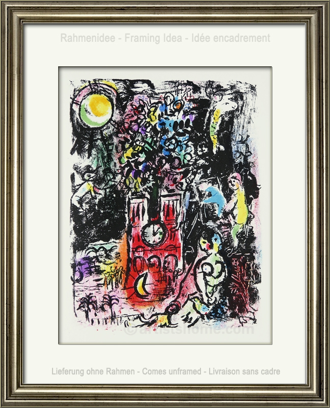 Aber es wäre nicht Chagall, stünde dieser Jesus Christus-Baum wie gewohnt mit seinen Wurzeln im Erdreich. Bei ihm wächst er zwischen den beiden Türmen der Kathedrale Notre-Dame direkt in den nächtlichen Pariser Himmel, in allen Farben leuchtend wie ein prächtiges Feuerwerk. Vertraute Chagallsche Symbole umrahmen ihn: der Fisch, diesmal mit Eselskopf, Sonne und Mond, der Maler mit seiner Staffelei, das Liebespaar mit Kind, als auch die große Uhr, die er der "Lieben Frau von Paris" kurzerhand verpasste. Dieser Steindruck wurde in unzähligen Farben von Chagall angelegt - was bedeutet, dass pro Farbe jeweils ein Lithographiestein von ihm bearbeitet werden musste.