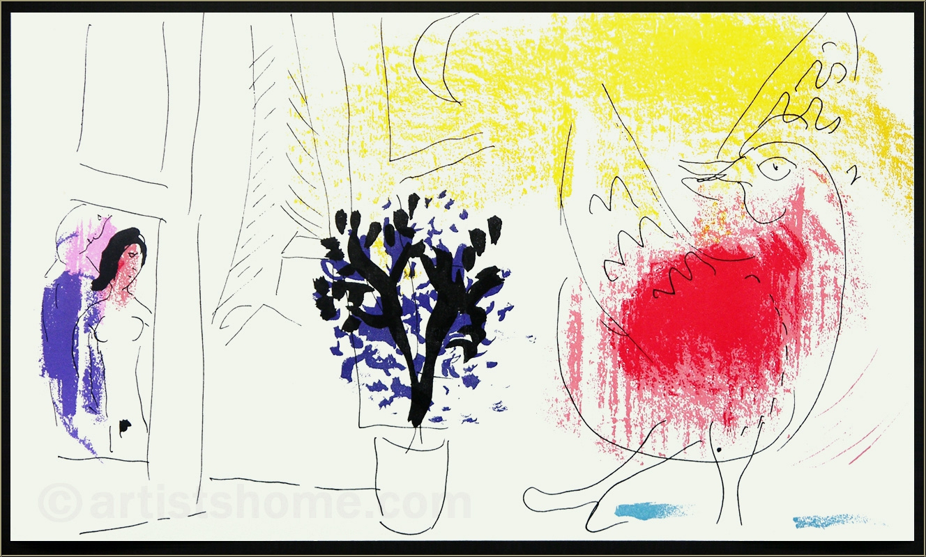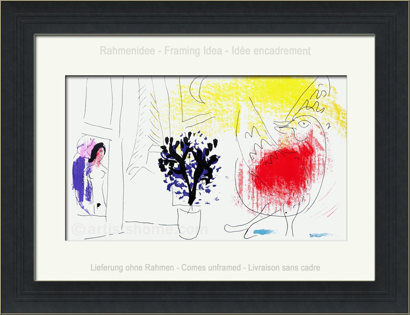 | | "Der rote Hahn / Le coq rouge" In dieser filigran gezeichneten Original-Farblithographie lässt Chagall ein Paar gedankenverloren aus dem Fenster seines Haus schauen. Den Gesichtszügen nach könnte es sich um ein Selbstbildnis des Künstlers handeln, zusammen mit seiner zweiten Ehefrau "Wawa", die er häufig portraitierte. Den Schwerpunkt der Zeichnung hat Chagall jedoch dem kugeligen, roten Hahn zugedacht, den er aufgeregt gestikulierend durch das Bild laufen lässt. | Technik: | Original-Farblithographie (Mourlot 203) Hinweis: Dies ist KEIN Kunstdruck, sondern die Original-Lithographie (Steindruck), wie sie exakt so auch im Werkkatalog verzeichnet ist! Achtung: es existieren zahlreiche Nachdrucke (Reproduktionen) aus einer nicht authorisierten, späteren Auflage. Diese Drucke sind keine Original-Lithographien! | | Jahr: | 1957 | | Größe: | 23 x 39 cm (Blattgröße) | | Auflage | Papier: | Hier eines von 6000 unsignierten Exemplaren auf glattem Velin. Zusätzlich wurden damals 90 Exemplare auf Arches Bütten mit breitem Rand gedruckt und vom Künstler signiert und nummeriert. | | Verleger: | Maeght Editeur, Paris | | Druck: | Mourlot, Paris | Werkverzeichnis/ Referenz: | Mourlot, Fernand. Chagall Lithograph [II] 1957-1962, André Sauret, Monte-Carlo 1963, Seiten 20-29, Nr. 203 Sie erhalten mit der Lieferung den Auszug aus diesem Verzeichnis, sowie zusätzlich einen Identitätsnachweis (ohne Preisangabe), falls das Blatt verschenkt werden soll. | | Zustand: | Erläuterungen hierzu Sehr schönes Exemplar aus dem Archiv. In diesem Zustand sehr selten! Lieferung ohne Rahmen. | | | Besonderheit: Diese empfindliche Originalgrafik wurde von unserem Restaurator, einem alteingesessenen Hamburger Fachbetrieb, sorgfältig geglättet, sodass der obligatorische Mittelfalz nun kaum noch sichtbar ist und die Grafik wunderbar gerahmt werden kann. Mehr über die konservatorische Erhaltung alter Grafiken und Plakate | Kundenbewertungen Bisher wurde noch keine Bewertung abgegeben. Bewertungen können nur von Kunden geschrieben werden, die den Artikel gekauft haben und eingeloggt sind. Ihre persönlichen Daten werden automatisch anonymisiert (Beispiel: "Jens H., Deutschland").  *Gültig für Lieferungen nach Deutschland bei Zahlung per PayPal. Bei Zahlung per Banküberweisung verlängert sich die Lieferzeit um 1-3 Tage ab dem Tag, an dem Sie überwiesen haben. Lieferzeiten für andere Länder sowie Informationen zur Berechnung des Liefertermins finden Sie hier |