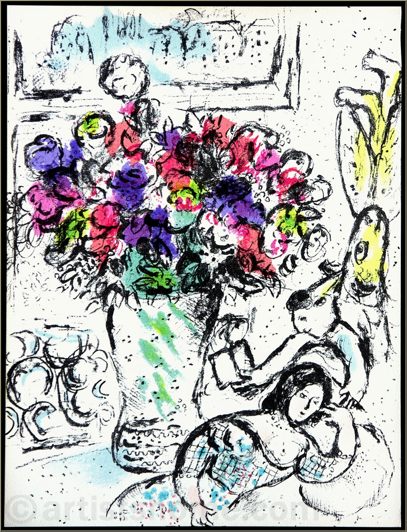 Diesen prächtigen, frühlingshaften Anemonenstrauß hat Chagall in überdimensionaler Größe auf den Lithostein gezeichnet, während das beieinander liegende Paar nur eine Nebenrolle einnimmt, genauso wie der kleine, gelbe Esel im Hintergrund. Das Blatt wurde auf kräftigem Büttenkarton gedruckt und erschien als Frontispiz-Seite (Titelbogen) für den vierten Band seines Oeuvre-Verzeichnisses.