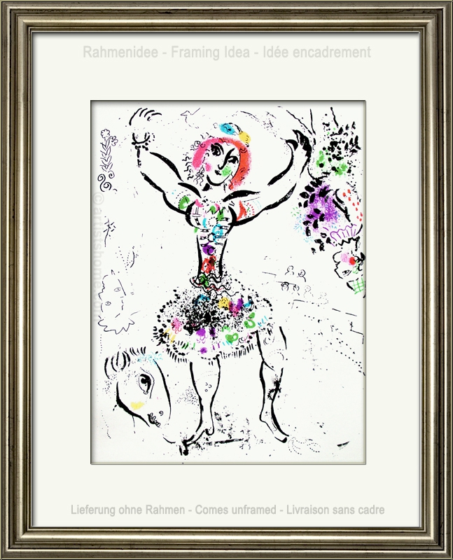 Wie auch in vielen anderen Lithographien untermalt Chagall das sich zutragende Schauspiel mit organischen Formen wie Blumen und Geäst mit einer spielerischen Leichtigkeit, die dem beschwingten Spiel des Jonglierens sehr nahe kommt. Gekonnt verbindet er immer wieder Tier und Mensch in Harmonie. Dem tiefschwarzen Duktus klarer Linien setzt er ein sanftes Kolorit entgegen. So verlieh das Malergenie durch einzelne, sehr farbenfrohe Pinselstriche in Magenta, Grün, Lila, Gelb und Blau der Szene genau das richtige Maß an Heiterkeit und Dynamik - ein Schauspiel, das man nicht müde wird zu bestaunen. Der rechts im Bild auf dem Kopf gezeichnete Harlekin verkörpert dabei die verrückte Welt des Zirkus, wie Chagall ihn Zeit seines Lebens liebte.