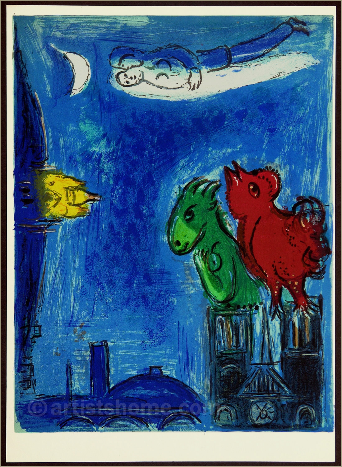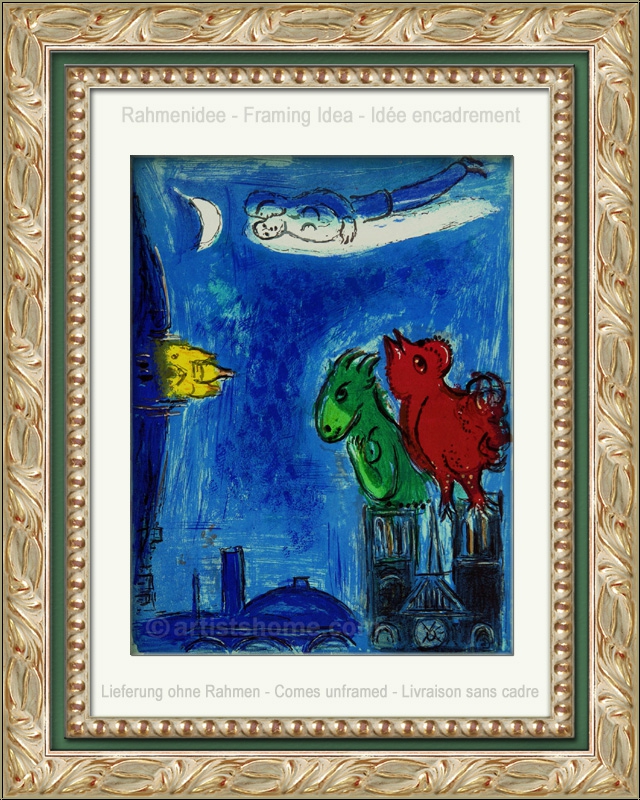 Details:Die Scheusale von Notre-Dame ("Les Monstres de Notre-Dame") So wenig, wie Quasimodo ein Monster war, so wenig sind die Chagallschen Tiere in diesem Bild Scheusale - mit einem Augenzwinkern dürfte Chagall dieser Lithographie ihren Namen gegeben haben. Denn obwohl er seine kleinen Ungeheuer in Übergröße auf die Spitzen von Notre-Dame verfrachtet hat, so blickt doch der Hahn eher sehnsüchtig auf das über ihm schwebende Liebespaar, während sich die Eselin nicht so richtig zwischen Sacre-Coeur und dem Pantheon zu entscheiden vermag. Eine friedliche Szene in der Pariser Abenddämmerung, und eine herrliche Grafik zur Erzählung von Quasimodo und Esmeralda in einer für Chagall typischen Bildkomposition und Farbwahl.