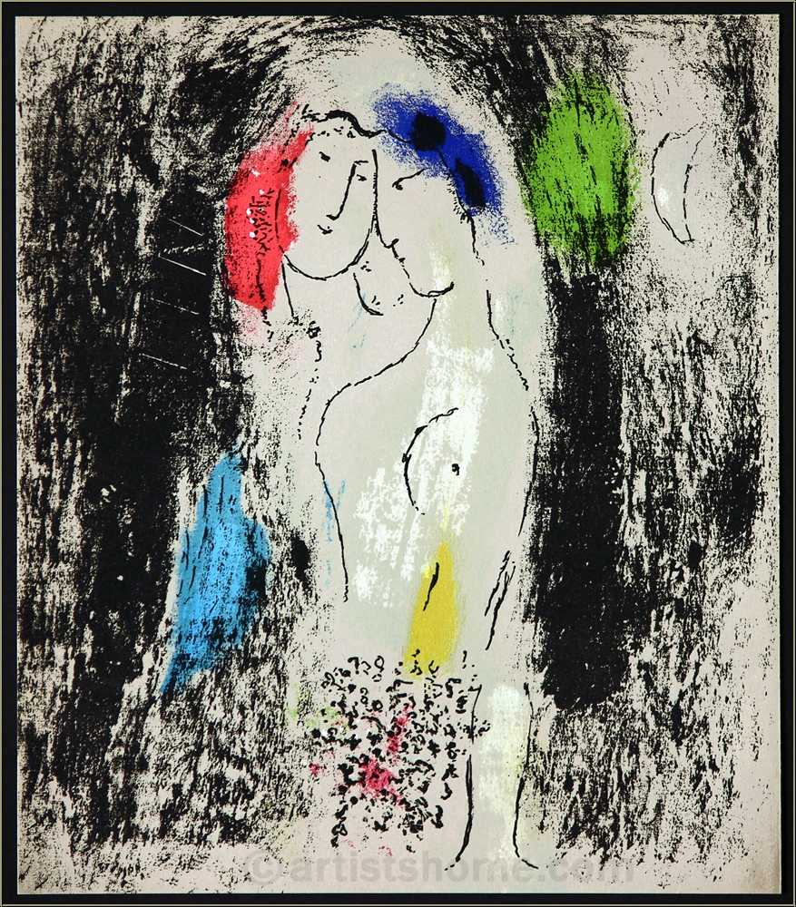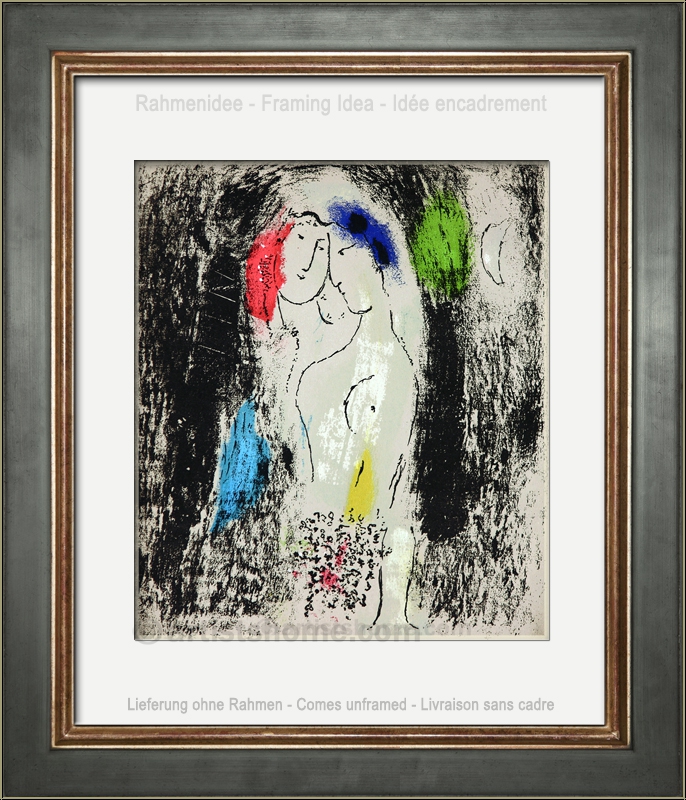 Details:"Die Verliebten in Grau / Les Amoureux en gris" Zärtlichkeit und Vertrautheit scheinen dieses ernst und versonnen dreinschauende Paar zu verbinden. Alles um sie herum liegt im Dunkeln, wurde ganz bewusst ausgeblendet, um die Bedeutung dieses innigen Moments zu verstärken. Dieses Bild ist eine von mehreren Liebesszenen, mit denen Marc Chagall die bedeutende Monographie über sein Leben bis 1957 ausstattete und sie damit auch zu einer Biographie werden ließ.