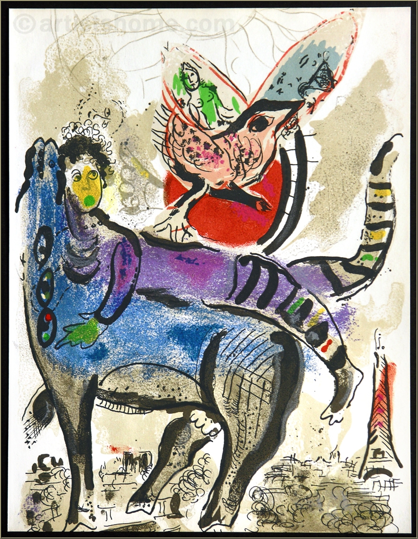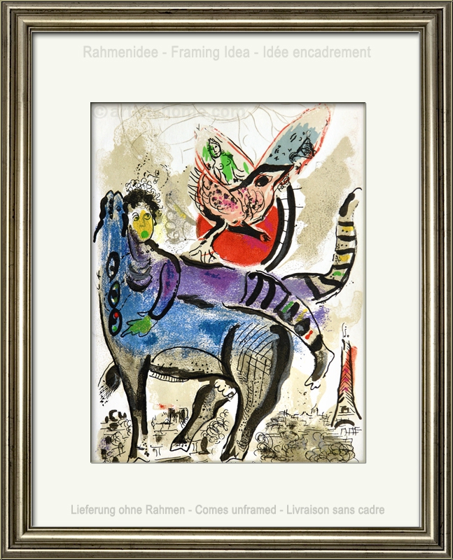 Im gleichen Jahr, in dem sein bedeutendes "Le Cirque"-Portfolio erschien, fertigte Marc Chagall diesen fröhlich-bunten, wunderschönen Steindruck. Dieses Einzelblatt wird im Werkverzeichnis der Druckgrafik unmittelbar vor den Cirque-Bildern aufgeführt - es darf also vermutet werden, dass der Künstler es bereits "mit dem Zirkus im Herzen" zeichnete. So scheint es dann auch einer seiner typischen Zirkusclowns zu sein, erkennbar an der bunten Hose, der sich am Hals der blauen Kuh festhält. Wohin des Weges die beiden sind, bleibt der Phantasie des Betrachters überlassen... zusammen mit dem großen Vogel und einer hübschen jungen Frau im Hintergrund scheinen sie sich im Luftraum über Paris zu befinden, wie der Eiffelturm deutlich macht.