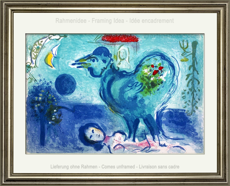 Wie ein Denkmal hat Marc Chagall den großen, stolzen Hahn in seine blaue Traumlandschaft gestellt, die von Bäumen, zwei Frauengestalten, einem Fisch mit Geige, einem Flötisten und einer blauen Sonne umrahmt ist. Es ist eines der besonders geheimnisvollen Bilder des Künstlers, in dem alltägliche Themen und Symbole seines tiefen Glaubens in einer rätselhaften Verbindung zueinander stehen.