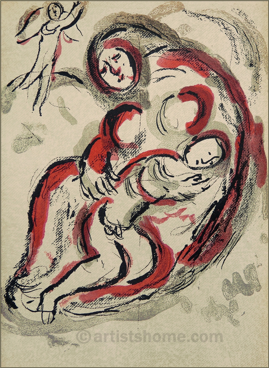 Marc Chagall: Hagar in der Wüste, Bibel 1960, Lithographie - Sohn Ismael, Armut, Abraham und Sara | Originale