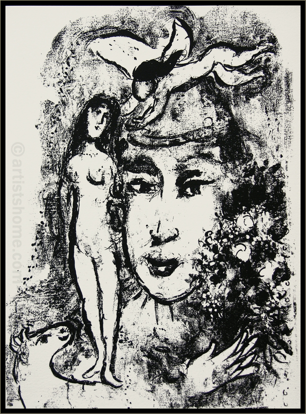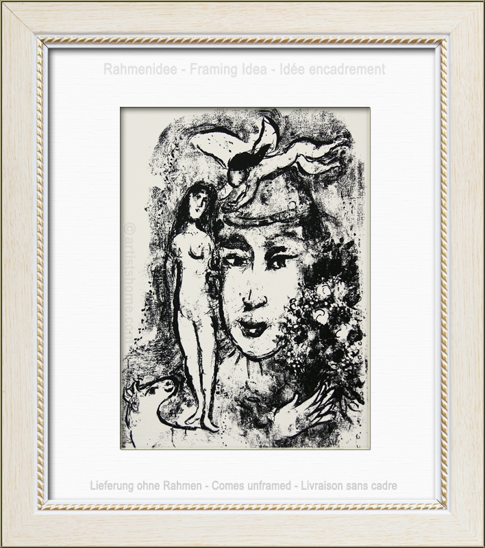 Der von Chagall so geliebte Zirkus steht im Mittelpunkt dieser filigranen, einfarbig in Schwarz gearbeiteten Lithographie. Ein von oben rechts in das Bild schwebender fliegender Engel als Synonym für die zauberhafte Akrobatin links im Bild, die auf dem Rücken eines gehörnten Eselchens zu balancieren scheint. Zusammen mit dem Blumenstrauß rechts im Bild formt sich vor unseren Augen ein Rahmen, aus dem uns das übergroße Portrait eines Clowns anschaut. Mit diesem surreal komponierten "Ensemble" erzeugt Chagall eine geradezu märchenhafte Atmosphäre - und das, obwohl Zirkuswelten und insbesondere Clowns oft eine tragisch-melancholische Stimmung vermitteln.