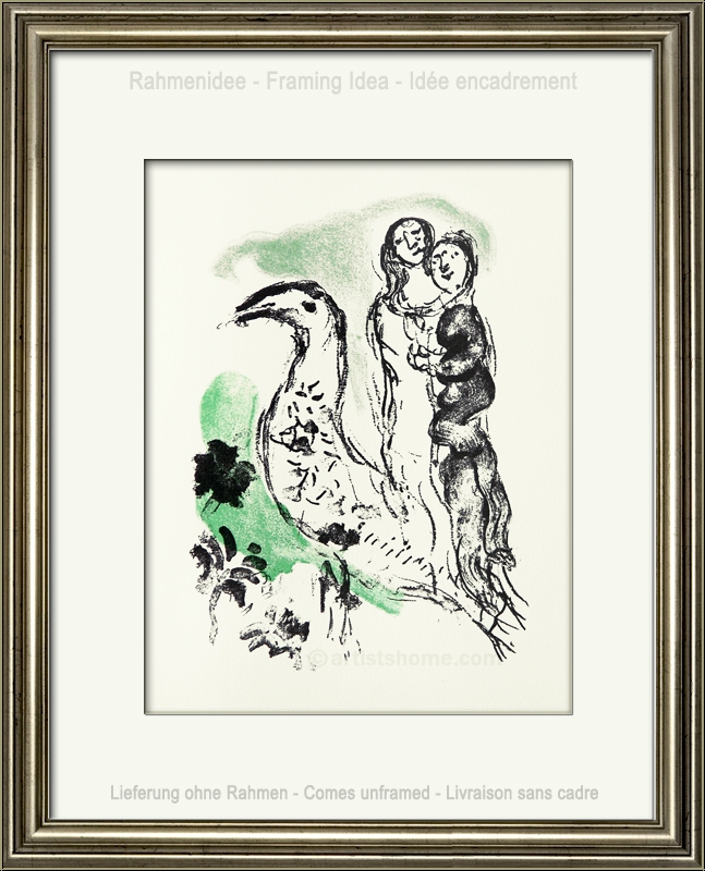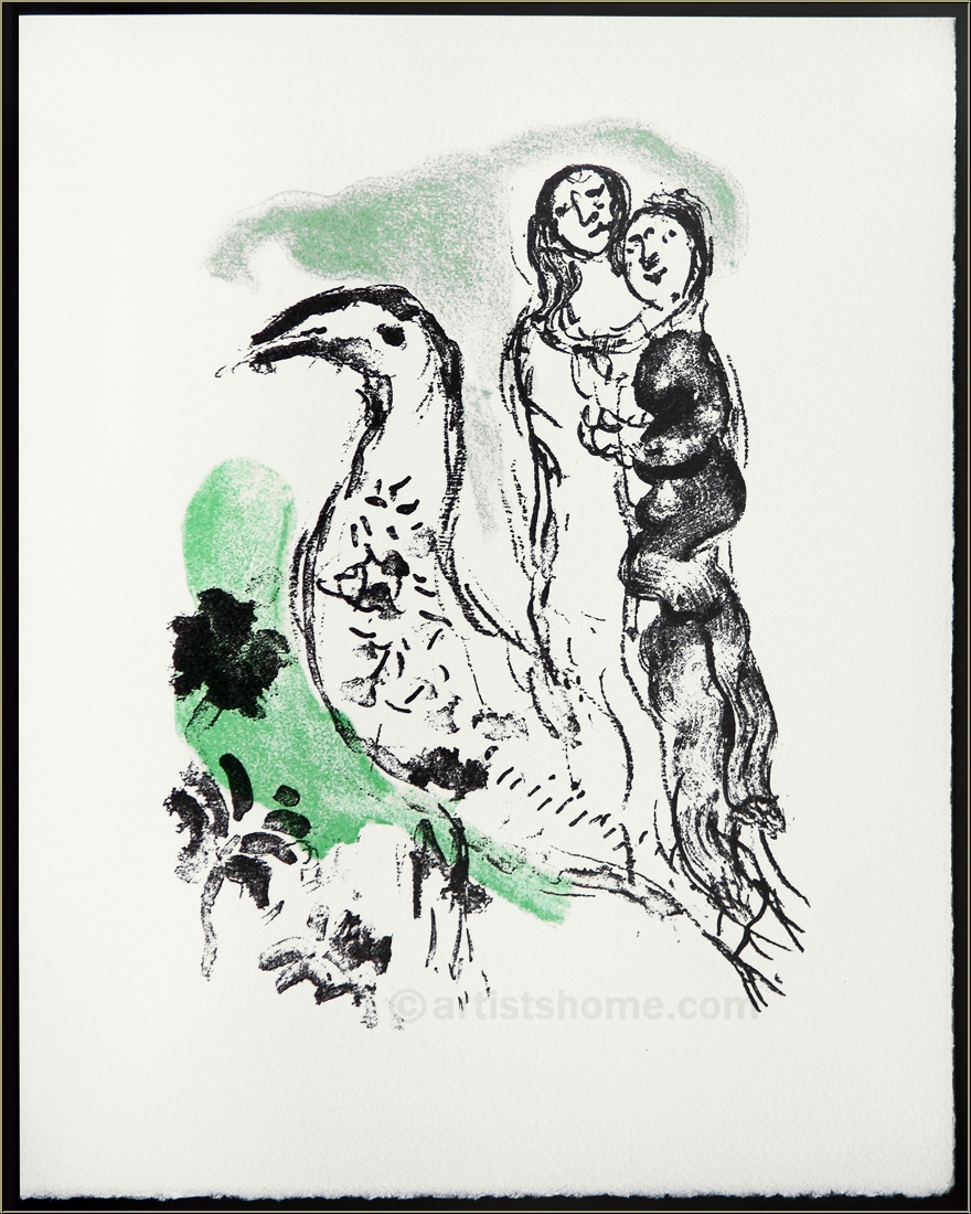 Ein Liebespaar, das sich im Gespräch mit einem auf der Durchreise befindlichen Ibis (oft auch als "Heiliger Ibis" bezeichnet) zu befinden scheint, begegnet uns in dieser ausserordentlich seltenen Grafik von Chagall. Dem Werkverzeichnis ist zu entnehmen, dass es sich bei den vier Lithographien, die der Künstler 1969 zu diesem Thema zeichnete, um seine einzigen Arbeiten mit dem exotischen Tier handelt. Diese bezaubernde Original-Farblithographie wurde als Frontispiz für den o.g. Band des französischen Autors L.S. Senghor auf kräftigem Arches Bütten abgezogen.