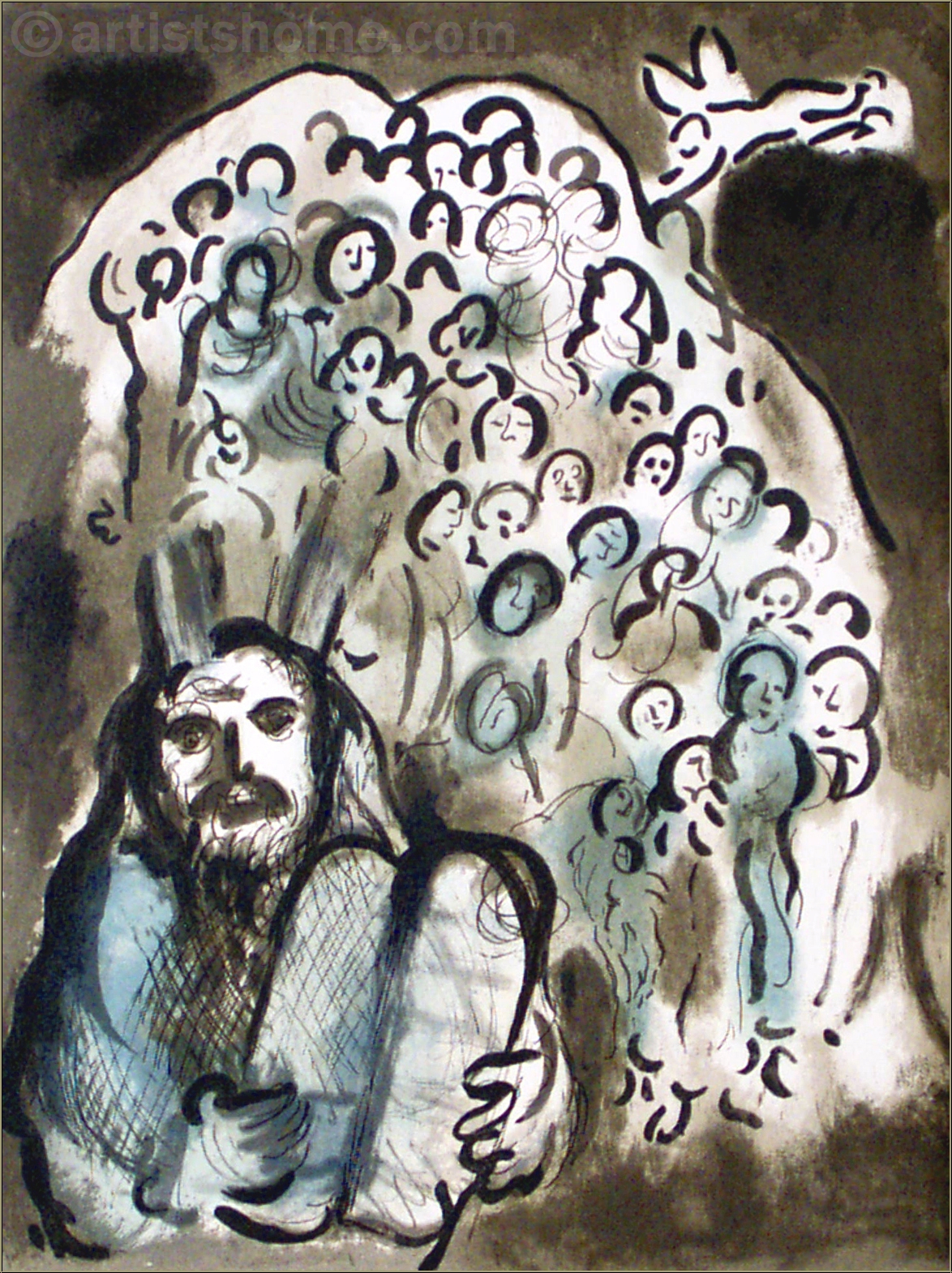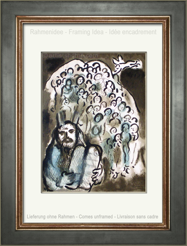 Details:"Moses und sein Volk" Mit der großzügigen Schenkung seiner Werke der 'Biblischen Botschaft' an den französischen Staat ermöglichte Chagall 1973 die Eröffnung des Musée National Message Biblique Marc Chagall in Nizza. Als Frontipizblatt für den damals herausgegebenen Prachtband arbeitete der Künstler diesen herrlichen Steindruck, der Moses mit den Gesetzestafeln im Arm zeigt, hinter sich eine wartende Menschenmenge und ein von Gott gesandter Engel.