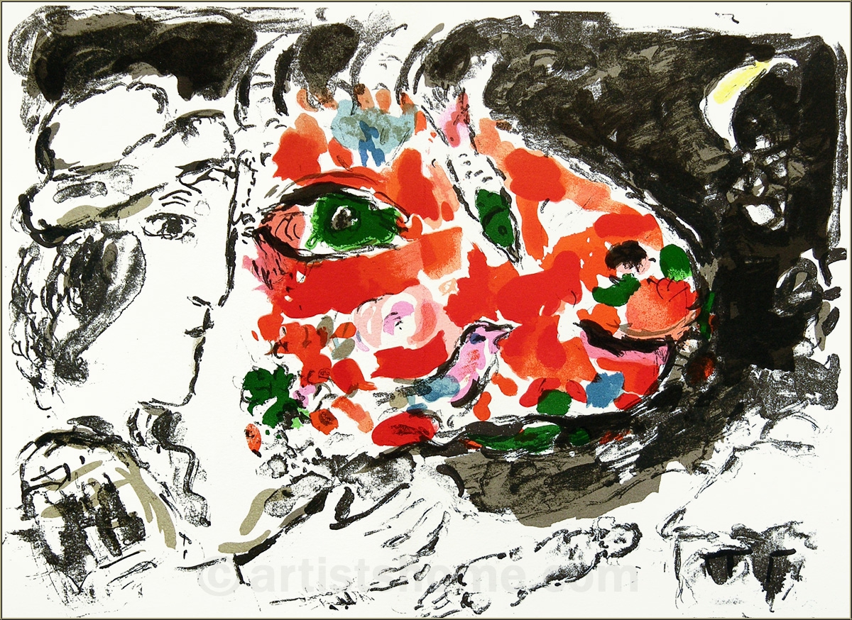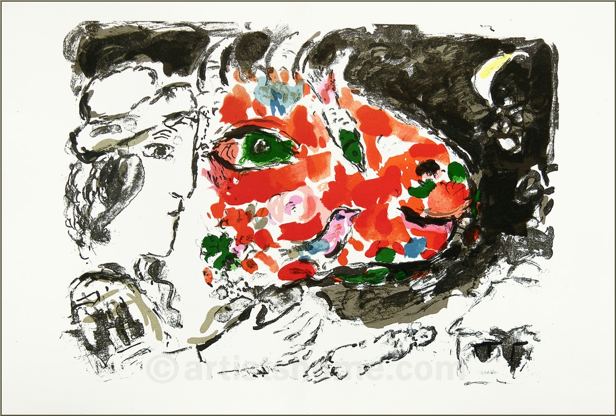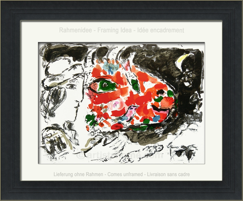 Details:"Après l'hiver" (Nach dem Winter) Der meist nicht enden wollende Winter lässt uns die Motivation Chagalls zu diesem ambivalenten Werk gut verstehen: einen Teil des Bildes zeichnete er in den blassen, unbunten Farben des Winters. Den Mittelpunkt bildet jedoch der fröhlich-bunte Kopf des "Chagallschen Tieres" (das gehörnte Eselchen), zu dem sich weitere Symbole aus der charakteristischen Fauna des Künstlers gesellen: der Fisch, und der Vogel. Passend zum Titel verheißt dieses farbenfrohe Trio den nahenden Frühling, der auch den Menschen endlich seiner Winterstarre entkommen lassen wird.