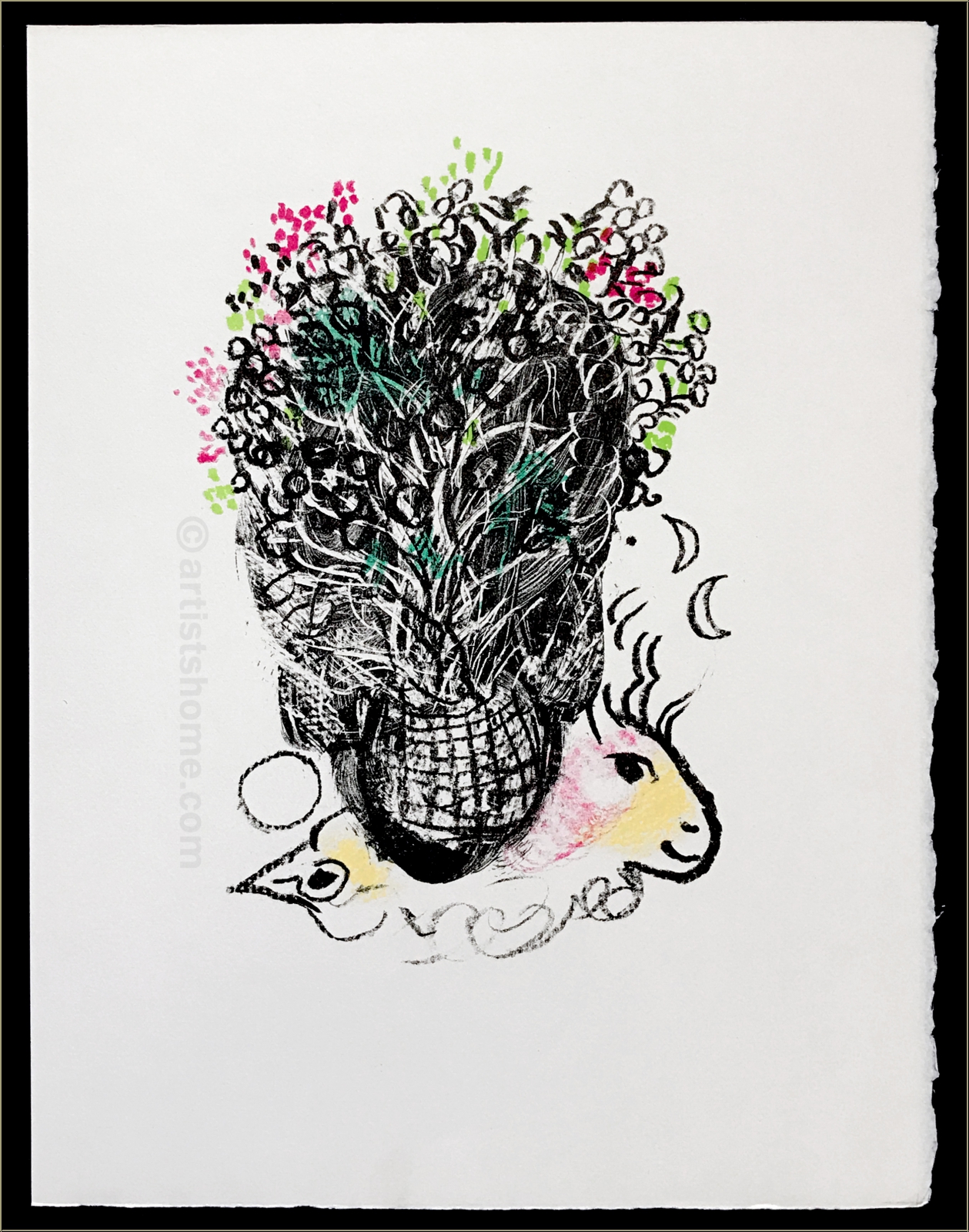 | | "Bouquet pour Fernand" Seltene Original-Farblithographie auf Arches Bütten von Marc Chagall für Fernand Mourlots Portfolio "Souvenirs et portraits d'artistes" (Vorzugsausgabe). Dies ist KEINE später gedruckte Massenware (Kunstdruck wie z.B. Grano- oder Offset-Lithographie), sondern die Original-Lithographie aus der Vorzugsausgabe von Mourlots Buch über sein Lebenswerk, wie sie exakt so auch im Werkkatalog verzeichnet ist. ACHTUNG: aktuell werden im Netz identisch aussehende Drucke angeboten - hierbei handelt es sich um gefälschte Nachdrucke (Raubkopien). Diese Grafiken sind KEINE Original-Lithographien, auch wenn sie auf der Rückseite mit "Lithographie originale" bedruckt und für den Laien kaum zu unterscheiden sind! | Auflage / Jahr: | 800 unsignierte Exemplare der Vorzugsausgabe | | Größe: | 32,5 x 25 cm (Blattgröße) | | Verleger: | Alain C. Mazo, Paris, 1972 | | Anmerkung: | Rücks. typografisch bezeichnet: Marc Chagall - Bouquet pour Fernand - Lithographie originale. | Werkverzeichnis/ Referenz: | Mourlot, F., Chagall Lithograph [IV] 1969-1973, André Sauret, Monte Carlo 1974, S. 100, Nr. 635, m. Abb. [1971] Sie erhalten mit der Lieferung den vollständigen Auszug aus dem o.g. Werkverzeichnis sowie zusätzlich einen Identitätsnachweis (ohne Preisangabe), falls das Blatt verschenkt werden soll. Außerdem erhalten Sie eine Kopie der Impressumseite mit der Nummerierung aus der Originalkassette zu Ihrem Blatt. | | | Kundenbewertungen Bisher wurde noch keine Bewertung abgegeben. Bewertungen können nur von Kunden geschrieben werden, die den Artikel gekauft haben und eingeloggt sind. Ihre persönlichen Daten werden automatisch anonymisiert (Beispiel: "Jens H., Deutschland").  *Gültig für Lieferungen nach Deutschland bei Zahlung per PayPal. Bei Zahlung per Banküberweisung verlängert sich die Lieferzeit um 1-3 Tage ab dem Tag, an dem Sie überwiesen haben. Lieferzeiten für andere Länder sowie Informationen zur Berechnung des Liefertermins finden Sie hier |