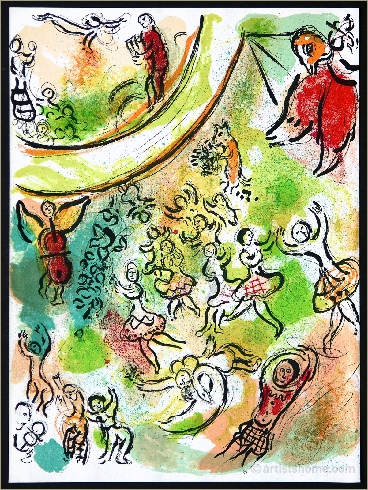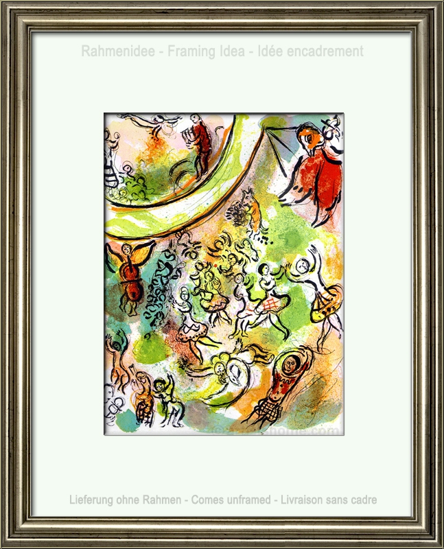 | | Diese prächtige Original-Lithographie zeichnete Marc Chagall eigens für den Band über sein Deckengemälde für die Pariser Oper, "Le Plafond de l'Opéra de Paris". Zu sehen ist ein fröhliches Völkchen musizierender und tanzender Wesen in den Farben des Wonnemonats Mai. Das 1963/64 von Chagall im Alter von 77 Jahren geschaffene 220 qm große Deckenfresko in der Kuppel des Theatersaals der Opéra Garnier feierte 2013 sein 50-jähriges Jubiläum. Marc Chagall wollte damit den Großen der von ihm so geliebten klassischen Musik Ehre erweisen, allen voran Mozart. Insgesamt 14 Komponisten sind in diesem "Himmel aus Musik, Oper und Ballett" mit ihren Werken verewigt, u.a. "Romeo und Julia" von Berlioz, Mussorgskis "Boris Godunow" und natürlich die "Zauberflöte". | | Größe: | 32 x 23,5 cm (Blatt) | | Papier: | glattes, kräftiges Vélin | | Auflage: | Eines von 5000 unsignierten Exemplaren auf glattem Velin. Es gab keine signierte Auflage von dieser Grafik! | | Verleger: | Editions André Sauret, Monte-Carlo 1965 | | Anmerkungen: | Dies ist KEIN späterer Kunstdruck, sondern die Original-Lithographie von 1965, wie sie so auch im Werkverzeichnis der Lithographien des Künstlers beschrieben ist. Die Rückseite des Blattes ist typografisch bedruckt mit einer Danksagung an "Madame Marc Chagall" für ihre Mithilfe bei der Erstellung des Bandes. | Werkverzeichnis/ Referenz: | Cain, Julien, Mourlot, Fernand, Sorlier, Charles. Chagall Lithographe [III] 1962-1968, André Sauret, Monte Carlo, 1969, S. 82, Nr. 434, mit Abb. Sie erhalten mit der Lieferung den Auszug aus diesem Verzeichnis, sowie zusätzlich einen Identitätsnachweis (ohne Preisangabe), falls das Blatt verschenkt werden soll. | | Zustand: | Erläuterungen hierzu Sehr schönes Exemplar aus dem Archiv. Lieferung ungerahmt (der gezeigte Rahmen gehört nicht zum Lieferumfang, er dient lediglich Ihrer Inspiration). | Dieses Blatt wird durch unseren Geschenk-Service verpackt | Kundenbewertungen Bisher wurde noch keine Bewertung abgegeben. Bewertungen können nur von Kunden geschrieben werden, die den Artikel gekauft haben und eingeloggt sind. Ihre persönlichen Daten werden automatisch anonymisiert (Beispiel: "Jens H., Deutschland").  *Gültig für Lieferungen nach Deutschland bei Zahlung per PayPal. Bei Zahlung per Banküberweisung verlängert sich die Lieferzeit um 1-3 Tage ab dem Tag, an dem Sie überwiesen haben. Lieferzeiten für andere Länder sowie Informationen zur Berechnung des Liefertermins finden Sie hier |