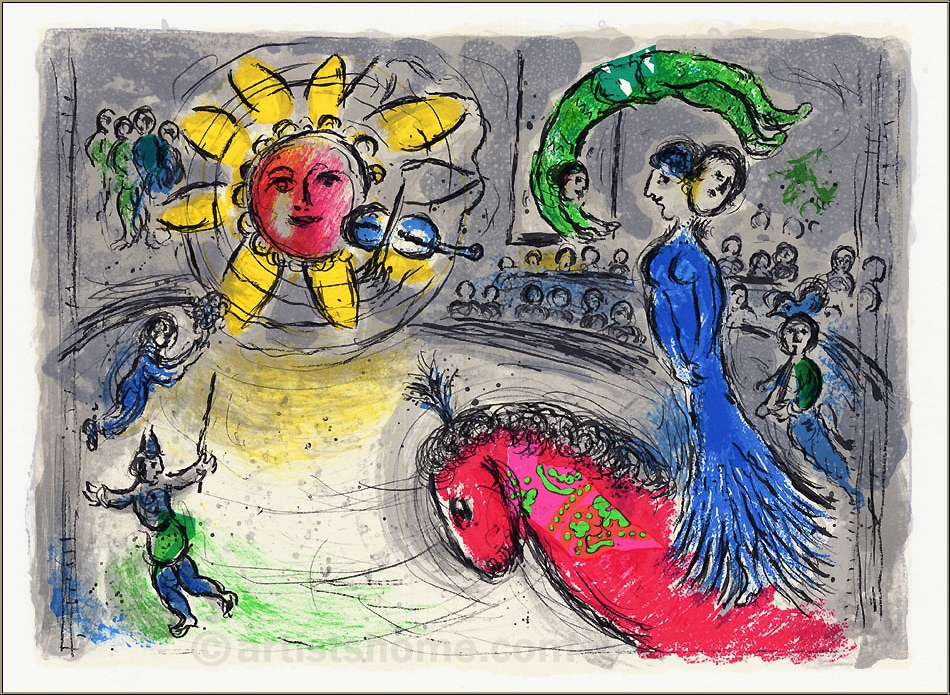 Mitten in einem vollbesetzten Zirkuszelt spielt eine gut gelaunte Sonne mit gelben Blütenblättern auf einer blauen Geige, während verschiedene Artisten dem Publikum ihre Darbietungen vorführen. Wir sehen eine Kunstreiterin im blauen Kostüm auf einem knallroten Pferd durch die Manege reiten, über ihr ein grün gekleideter Trapezkünstler seinen Salto schlagen. Clowns und Publikum machen diese fröhliche Szene komplett. Dieses Motiv zählt zu den schönsten druckgrafischen Werken Chagalls.