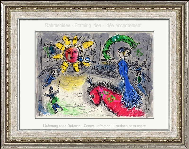 12 Jahre nach Erscheinen seines berühmten Künstlerbands mit Bildern über das Leben im Zirkus, "Le Cirque", hat Marc Chagall dieses Thema wieder aufgegriffen und diese zauberhaft schöne Originalgrafik lithographiert.