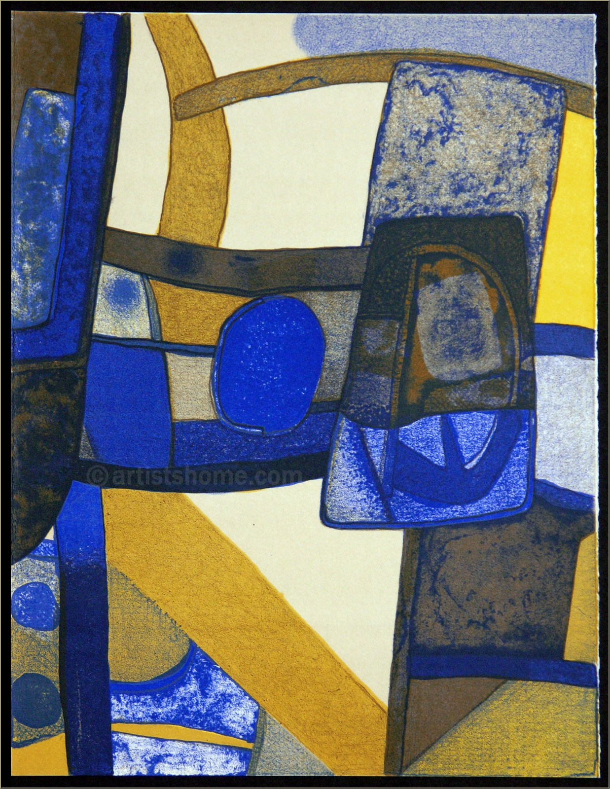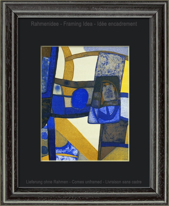 Diese abstrakte und für Estève typische Komposition in leuchtenden Blau- und Ockertönen war der Beitrag des Künstlers zu einem illustrierten Band, mit dem der Meisterdrucker und -lithograph Fernand Mourlot seiner langjährigen Zusammenarbeit mit den ganz Großen der bildenden Kunst aus der Ecole de Paris gedachte. Einige von ihnen, darunter Braque, Matisse, Villon und Giacometti, lebten 1972 bereits nicht mehr, andere - wie Picasso - starben kurz darauf. Souvenirs et portraits d'artistes gilt deshalb als Vermächtnis des begnadeten Handwerkers und Verlegers.