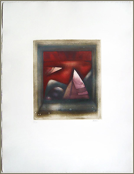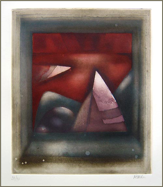 Abstrakte Originalradierung der Französin Michèle Nedelec in ihren Farben der Dämmerung. Auf BFK Rives Bütten, signiert u. nummeriert.